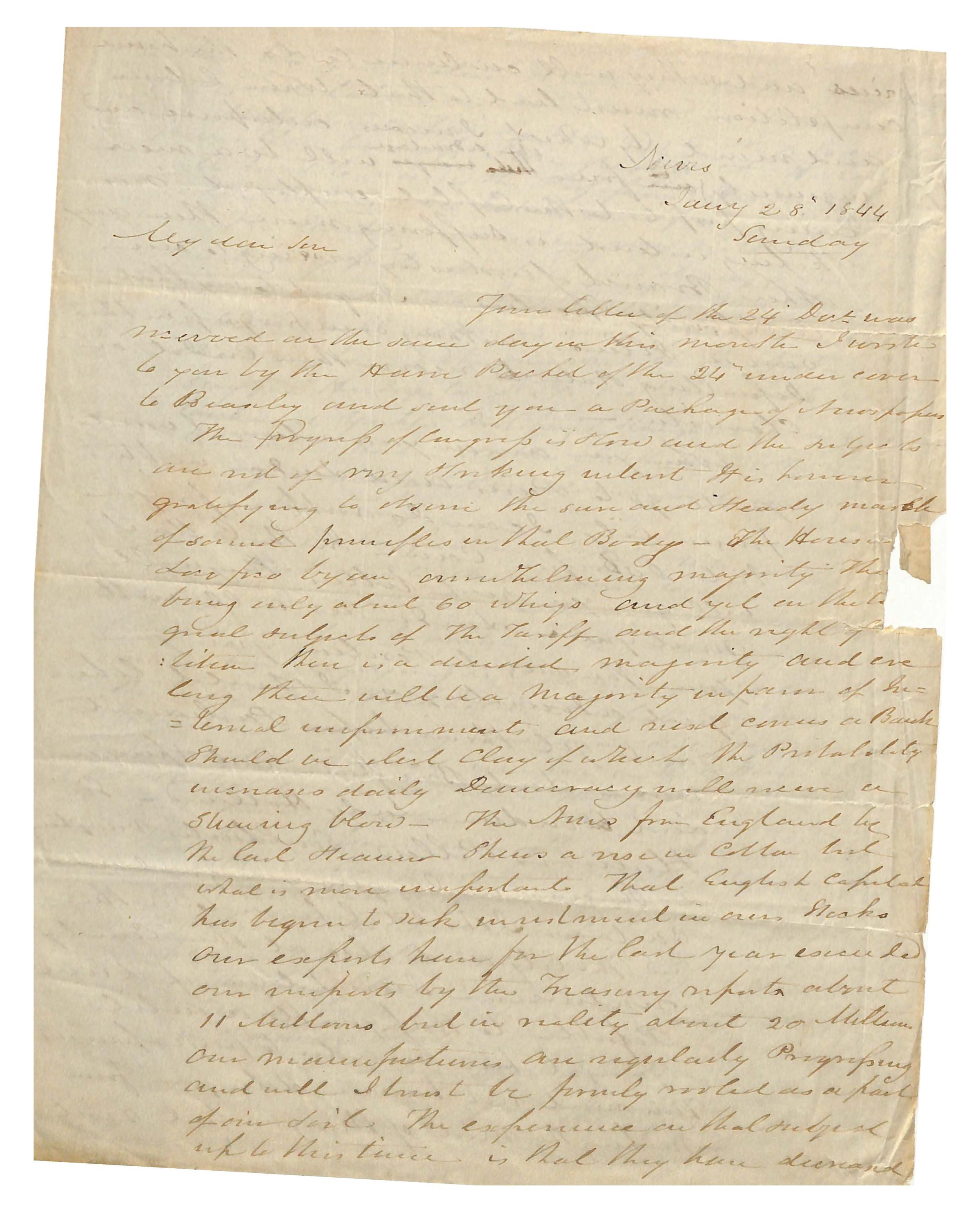 : -[lition?] there is a decided majority and ere / long there will be a Majority in favor of m= / =terial improvements and next comes a Bank / Should we elect Clay of which the Probability / increases daily Democracy will receive a / Stunning blow _ The News from England by / the last steamer shews a rise in Cotton but / what is more unfortunate That English capital / has begun to sink unrestrained in our Stocks / our exports have for the last year exceeded / our imports by the Treasury reports about / 11 Millions but in reality about 20 Millions / our manufacturer are regularly Progrefsing / and will I trust be firmly rooted as a part / of our [?bill?] The experience on that subject / up to this time is that they have decreased /