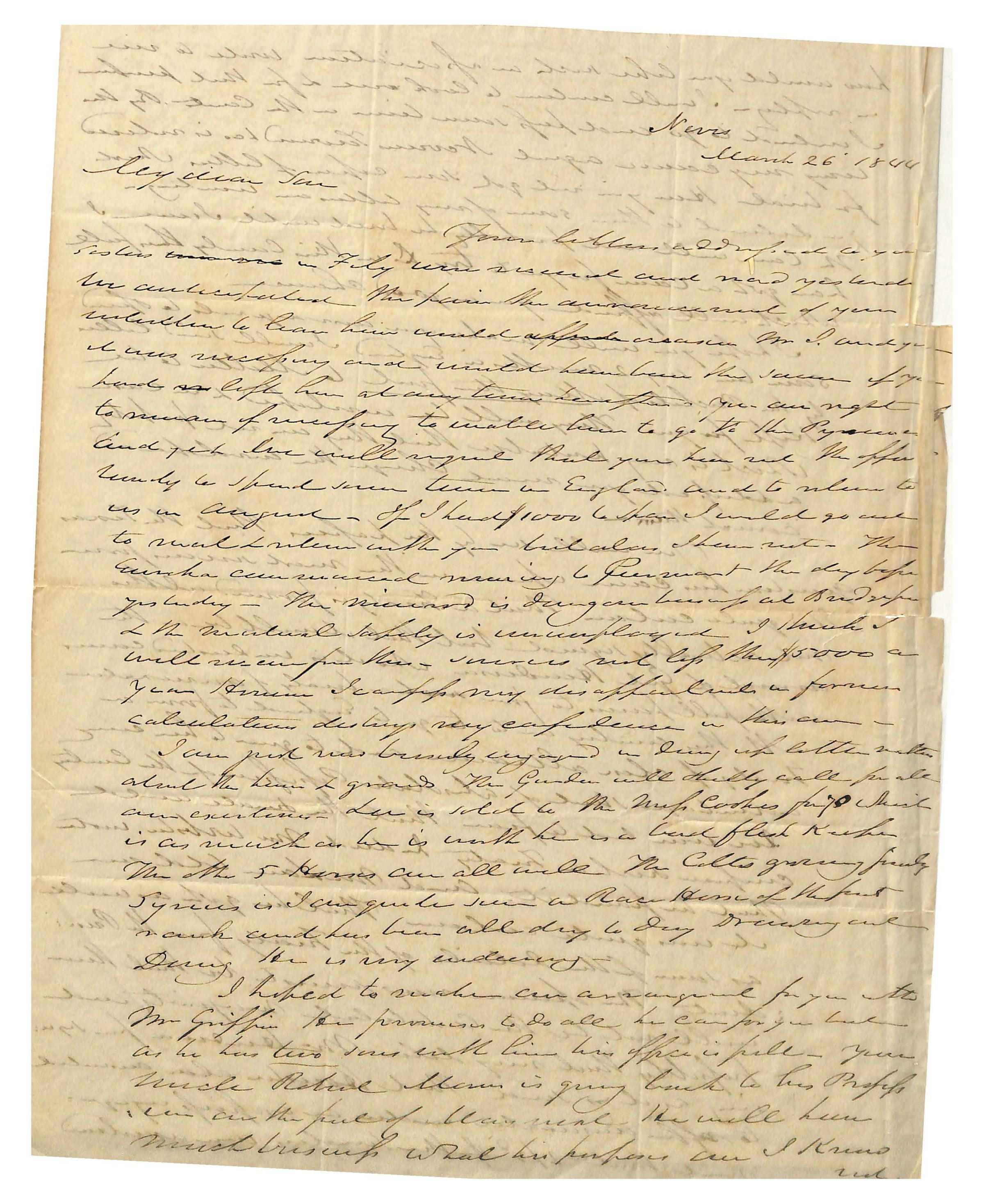 Your letters addressed to your / sisters were re in Feby were received and read yesterday / we anticipated the pain the announcement of your / [?resolution?] to leave him would afford [?cause] Mr. I and yet / it was necessary and would have been the same if you / had left him at any time hereafter _ you are right / to remain of necefsity to enable him to go to the Pyrennees / and yet [I’ve?] will require that you [??] not the oppor: / tunity to spend some time in England and to return to / us in August _ If I had $1000 to spare I would go out / to [travel?] + return with you but alas I have not _ The / Eureka commenced [?running] to Piermont the day before / yesterday _ The [winward?] is doing our business at Bridgeport / + the Mutual Safety is [??] employed I think I / will receive from them sources not lefs that $5000 a / year However I confess my disappointment in former / calculations destroys my confidence in this area _