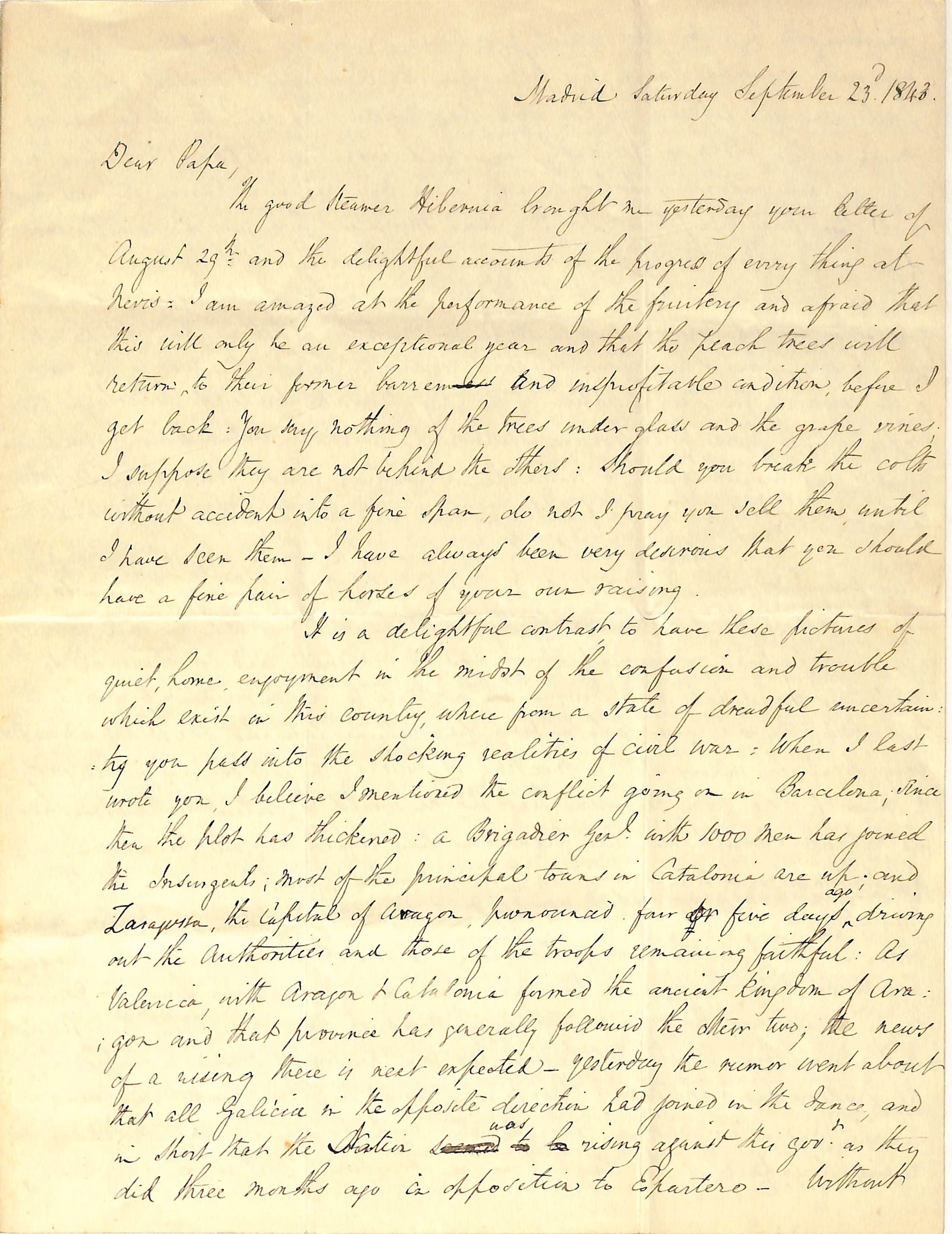 It is delightful contrast to have these pictures of / quiet, home, enjoyment in the midst of the confusion and trouble / which exist in this country, where from a state of dreadful uncertain - / ty you pass into the shocking realities of civil war : When I last / wrote you, I believe I mentioned the conflict going on in Barcelona, since / then the plot has thickened : a Brigadier Gen’l with 1000 men has joined / the Insurgents; most of the principal towns in Catalonia are up; and / Zaragessa, the capital of Aragon + Catalonia formed the ancient kingdom of Ara : / gon and that province has generally followed the other two; the news / of a rising there is next expected _ Yesterday the rumor went about / that all Galicia in the opposite direction had joined in the dance, and / in short that the Nation seemed to be [^ was] rising against this gov’t as the / did three months ago in opposition to Espartero _ Without /