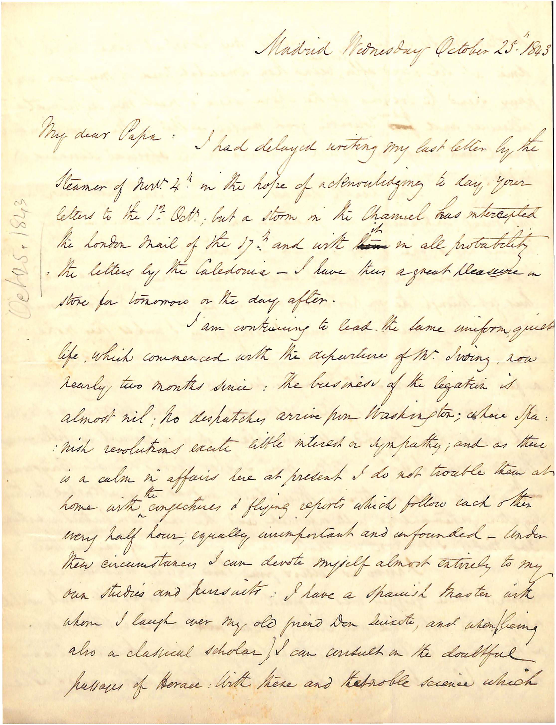 I am continuing to lead the same uniform, quiet / life which commenced with the departure for Mr. Irving, now / nearly two months since : The business of the legation is / almost nil; no despatches arrive from Washington; where Spa: / :nish revolutions excite little interest or sympathy; and as there / is a calm in affairs here at present I do not trouble them at / home with [^ the] conjectures + flying reports which follow each other / every half hour; equally unimportant and unfounded _ Under / these circumstances I can devote myself almost entirely to my / own studies and pursuits : I have a spanish master with / whom I laugh over my old friend Don Quixote, and whom (being / also a classical scholar) I can consult on the doubtful / passages of Horace : With these and that noble science which /