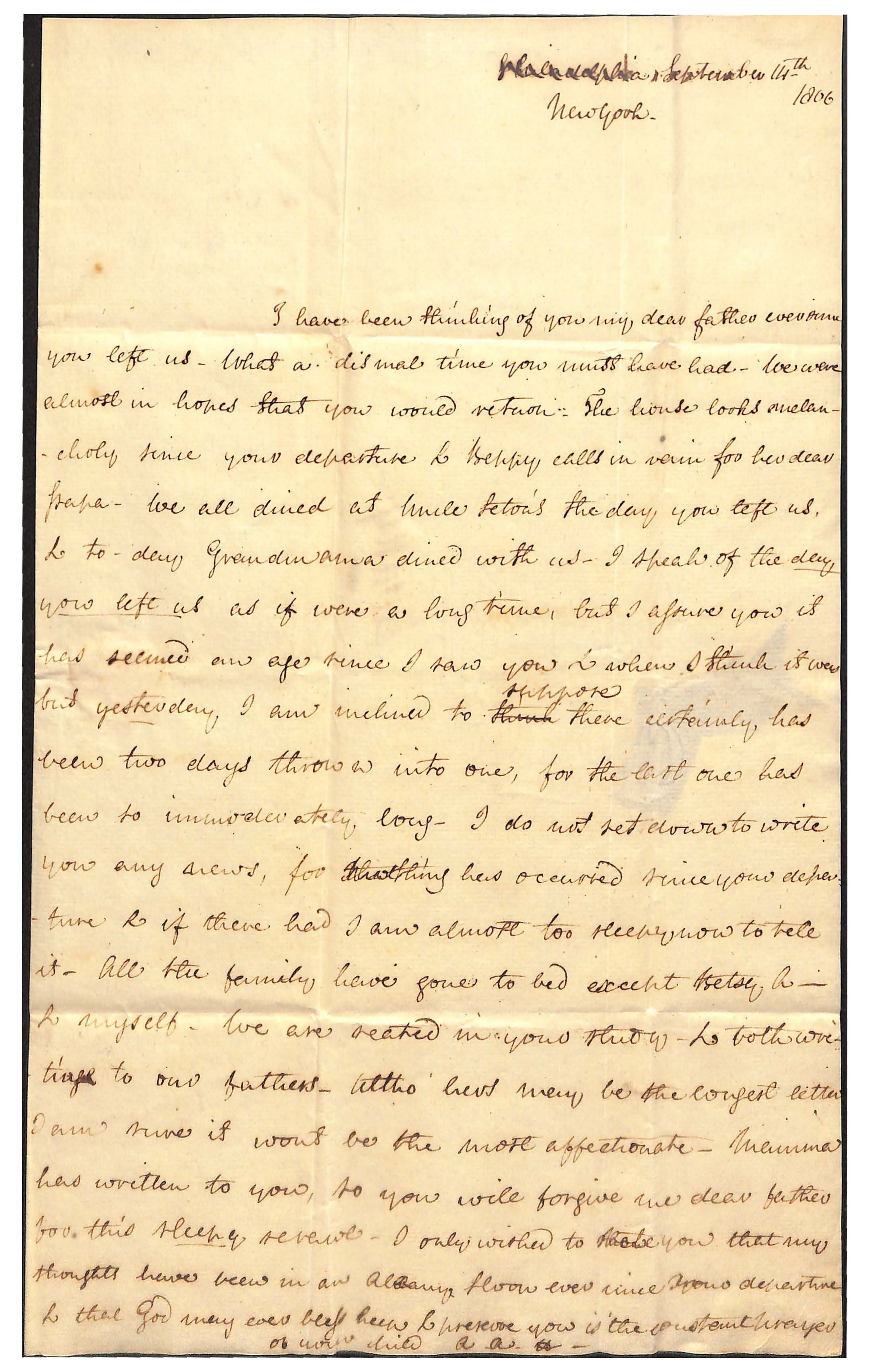 *Original spelling retained throughout work; content appears exactly as written. [crossed out] September 14th/ 1806/ New York I have been thinking of you my dear father ever since/ you left us- What a dismal time you must have had- We were/ almost in hopes that you would return- The house looks melan-/ -choly since your departure & Beppy calls in vain for her dear/ Papa- We all dined at Uncle Seton’s the day you left us,/ & to-day Grandmama dined with us- I speak of the day/ you left us as if were a long time, but I assure you it/ has seemed an age since I saw you & when I think it was/ but yesterday I am inclined to [∧ suppose] there certainly has/ been two days thrown into one, for the last one has/ been so immoderately long- I do not set down to write/ you any news, for [crossed out] nothing has occurred since your depar-/ -ture & if there had I am almost too sleepy now to tell/ it- All the family have gone to bed except Betsy A- / & myself- We are seated in your study & both wri-/ -ting to our fathers- Altho hers may be the longer letter/ I am sure it wont be the mote affectionate- Mamma/ has written to you, so you will forgive me dear father/ for this sleepy scrawl- I only write to [crossed out] show you that my/ thoughts have been in an Albany floor ever since your departure/ & that God may ever bless keep & preserve you is the constant prayer/ of your child/ A-A-H [END OF PAGE 1] [Add On]I will write you my dear father in a few days/ When you read this consider how early I go to bed and it/ is now near 11 o clock, so I am sure you will pardon it/ Good night- may you ever rest well & sometimes dream/ of your ever affectionate/ Alice [END OF PAGE 2] [Address; written on letter] Josiah Ogden Hoffman Esqr/Albany [Postmark]New York, Sept 15 [END OF LETTER]Created By