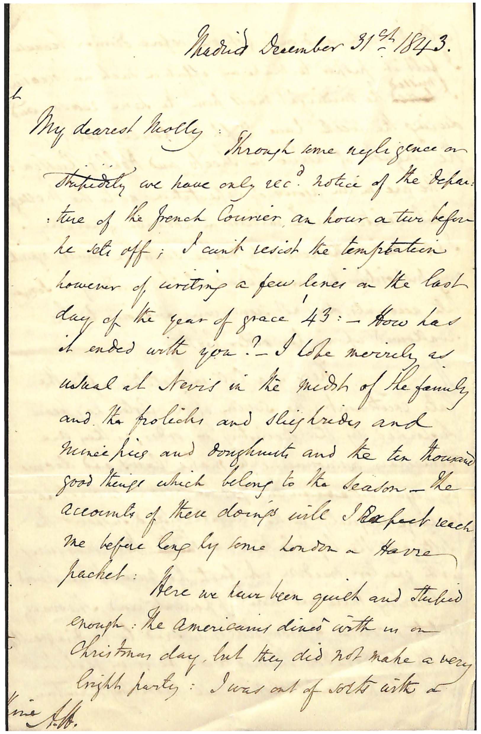 Through some negligence or / stupidity we have only rec’d notice of the depar: / :ture of the French Courier an hour or two before / he sets off; I can’t resist the temptation / however of writing a few lines on the last / day of the year of grace 43 : _ How has / it ended with you? _ I hope merrily as / usual at Nevis in the midst of the family / and the frolics and sleigh rides and / mince pies and doughnuts and and the ten thousand / good things which belong to the season _ The / accounts of these doings will I expect reach / me before long by some London or Havre / packet :