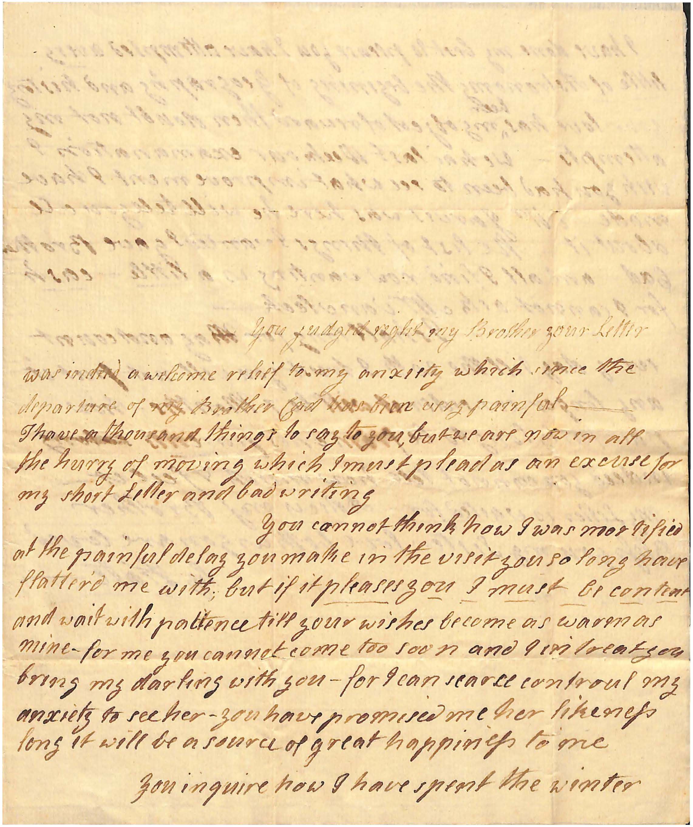 You judged right my Brother your Letter/ was indeed a welcome relief to my anxiety which since the/ departure of my Brother [unrecovered] has been very painful-/I have a thousand things to say to you, but we are now in all/ the hurry of moving which I must plead as an excuse for/ my short Letter and bad writing/