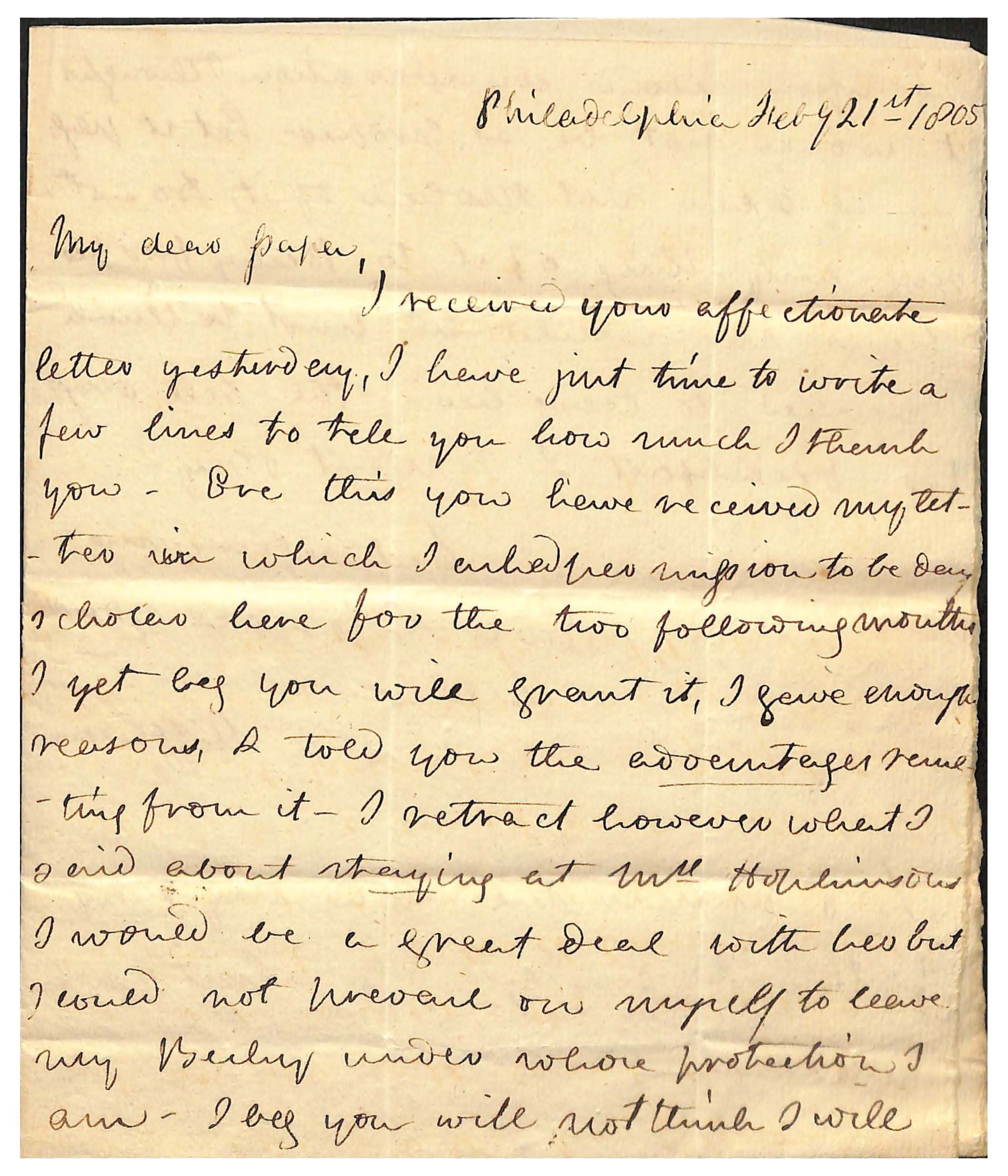 I received your affectionate / letter yesterday, I have just time to write a / few lines to tell you how much I thank / you _ [Ere] this you have received my let - / ter in which I asked permission to be day / scholar here for the two following months / I yet beg you will grant it, I gave enough / reasons, & told you the advantages resul- / ting from it- I retract however what I / said about staying at Mrs. Hopkinsons / I would be a great deal with her but / I could not prevail on myself to leave / my Becky under whose protection I / am- I beg you will not think I will