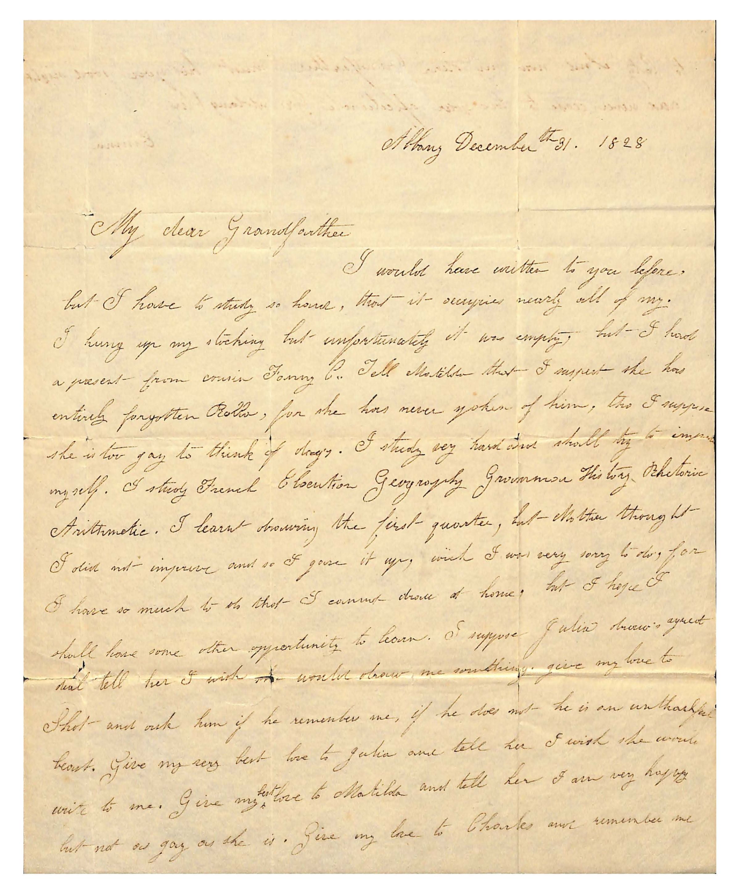 I would have written to you before,/ but I have to study hard, that it requires nearly all of my./ I hung up my stocking but unfortunately it was empty, but I had/ a present from cousin Fanny C. Tell Matilda that I suspect she has/ entirely forgotten Rollo, for she has never spoken of him, tho I suppose/ she is too gay to think of [trag’y.] I study very hard and shall try to improve/ myself. I study French Elocution Geography Grammar History Rhetoric/ Arithmetic. I learnt drawing the first quarter, but Mother thought/ I did not improve so I gave it up, which was very sorry to do for/ I have so much to do that I cannot draw at home, but I hope I/ shall have some other opportunity to learn. I suppose Julia knows a great/ deal tell her I wish she would draw me something. give my love to/ [unrecovered]hot and ask him if he remembers me, if he does not he is an unthankful/ beast. Give my very best love to Julia and tell her I wish she would/ write to me. Give my [inserted: best] love to Matilda and tell her I am very happy/ but not as gay as she is. Give love to Charles and remember me/