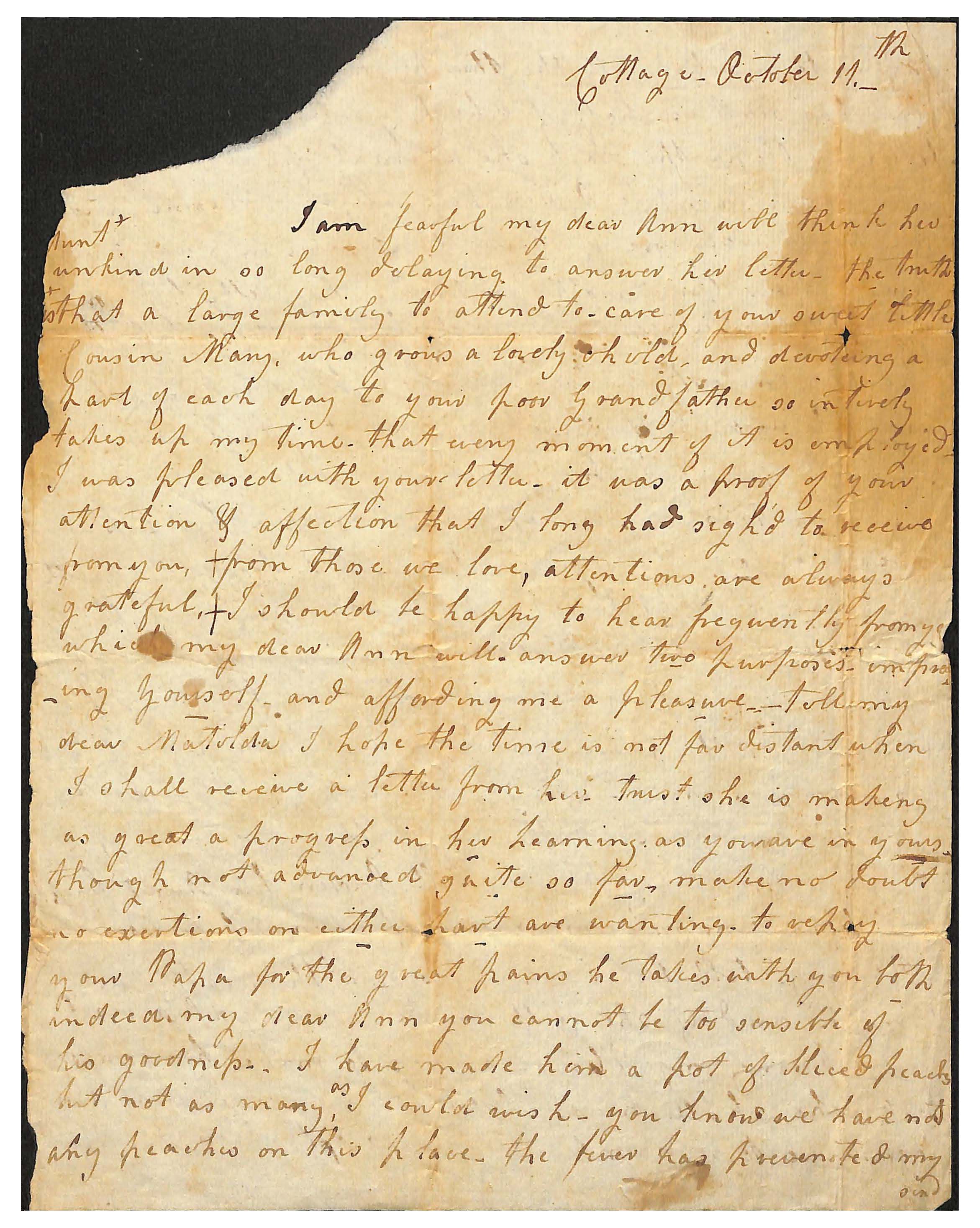 [Page torn in corner] I am fearful my dear Ann will think her / Aunt unkind in so long delaying to answer her letter- the truth / is that a large family to attend to- care of your sweet little / Cousin Mary, who grows a lovely child and devoting a / part of each day to your poor Grandfather so entirely / takes up my time. that every moment of it is employed / I was pleased with your letter _ it was a proof of your / attention & affection that I long had sigh’d to receive / from you, + from those we love, attentions are always / grateful, + I should be happy to hear frequently from you / which my dear Ann will answer two purposes improv/-ing yourself and affording me a pleasure- tell my / dear Matilda I hope the time is not far distant when I shall receive a letter from her trust she is making / as great a progress in her learning as you are in yours / though not advanced quite so far, make no doubt / no exertion on either part are wanting to repay / your Papa for the great pains he takes with you both / indeed my dear Ann you cannot be too sensible of / his goodness. I have made him a pot of sliced peaches / but not as many [inserted: as] I could wish- you know we have not / any peaches on this place- the fever has prevented my