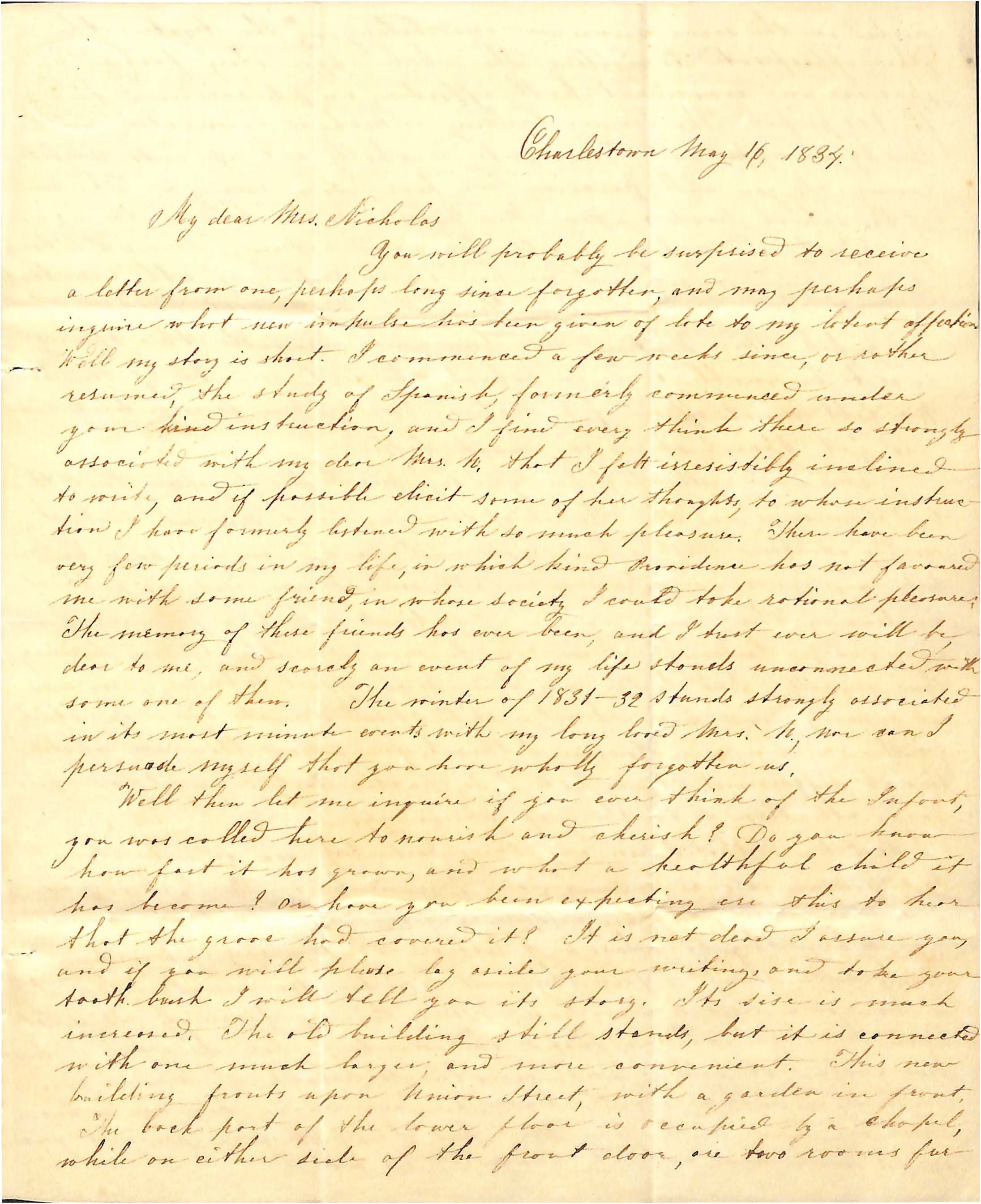 You will probably be surprised to receive/ a letter from one, perhaps long since forgotten, and may perhaps/ inquire what new impulse has been given of late to my distant affection./ Well my stay is short. I commenced a few weeks since, or rather/ resume the study of Spanish, formerly commenced under/ your kind instruction, and I find every think there so strongly/ associated with my dear Mrs N that I felt irresistibly inclined/ to write, and if possible elicit some of her thoughts, to whose instruct-/tion I have formerly listened with so much pleasure. There have been/ very few friends in my life, in which kind providence has not favored/ me with some friend, in whose society I could take rational pleasures./ The memory of these friends has ever been, and I trust ever will be/ dear to me, and scarcely an event of my life stands unconnected with/ some time of them. The winter of 1831-2 stands strongly associated/ in its most minute events with my long loved Mrs N, nor can I/ persuade myself that you have wholly forgotten us./