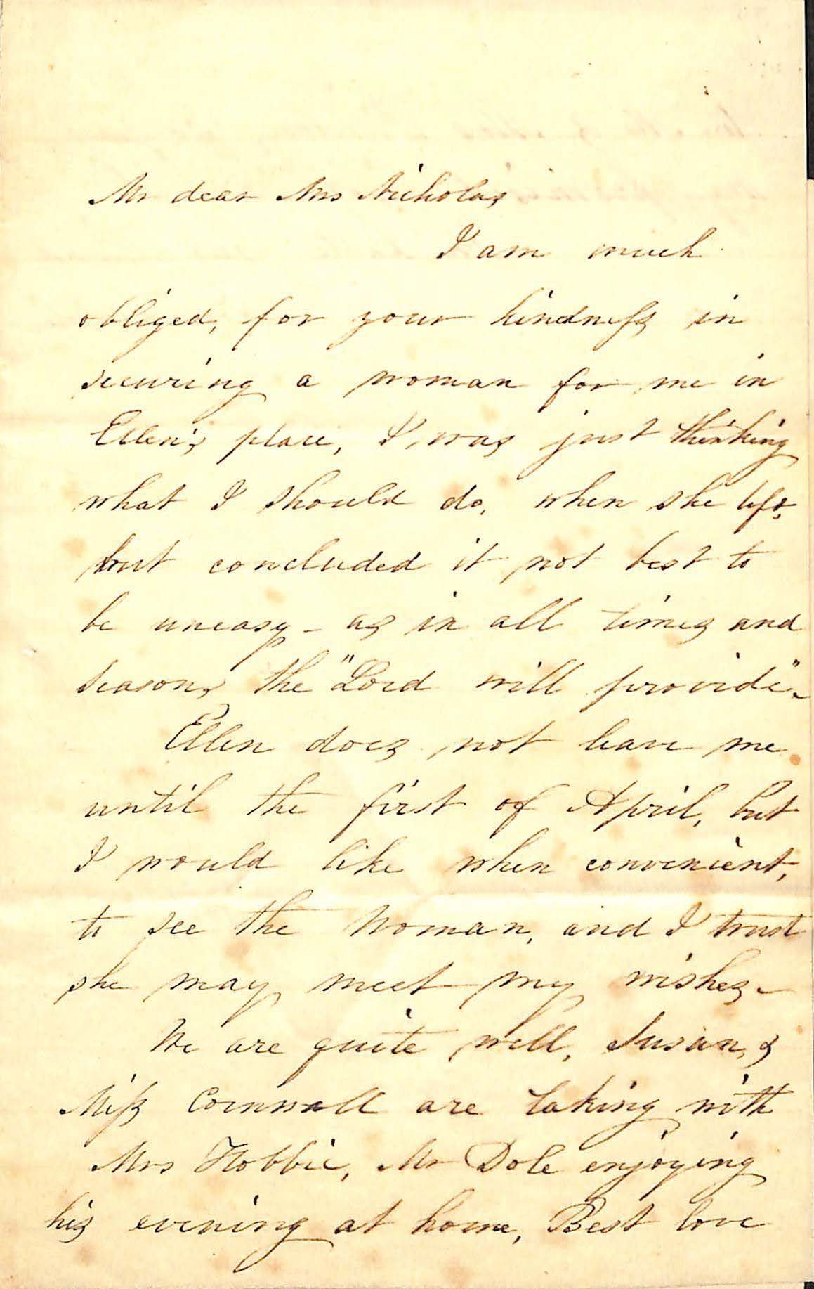 I am much/ obliged for your kindness in/ securing a woman for me in Ellen’s place, I was just thinking/ what I should do when she left but concluded it not best o/ be uneasy as in all times and/ seasons the “Lord will provide.”/