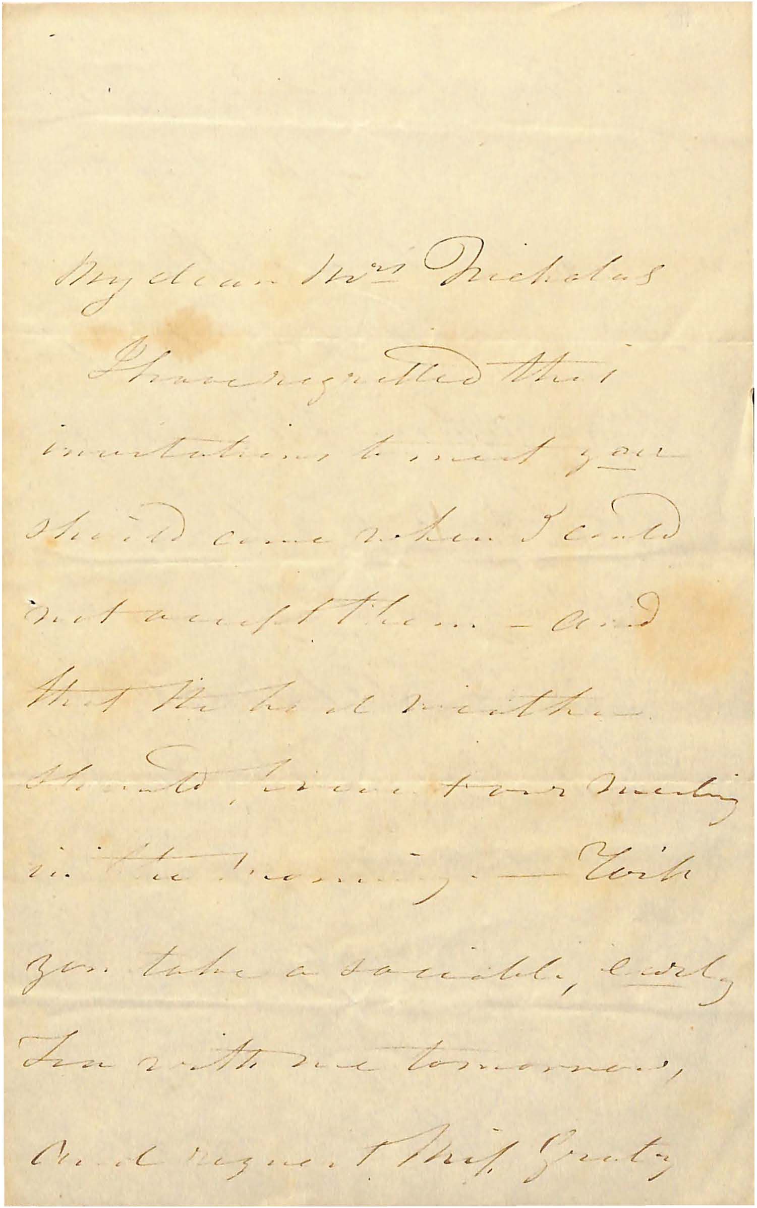 I have regretted that / invitations to meet you / should come when I could / not accept them _ and / that the bad weather / should prevent our meeting / in the morning __ Will / you take a sociable, early / Tea with me tomorrow, / and request Miss Gratz /