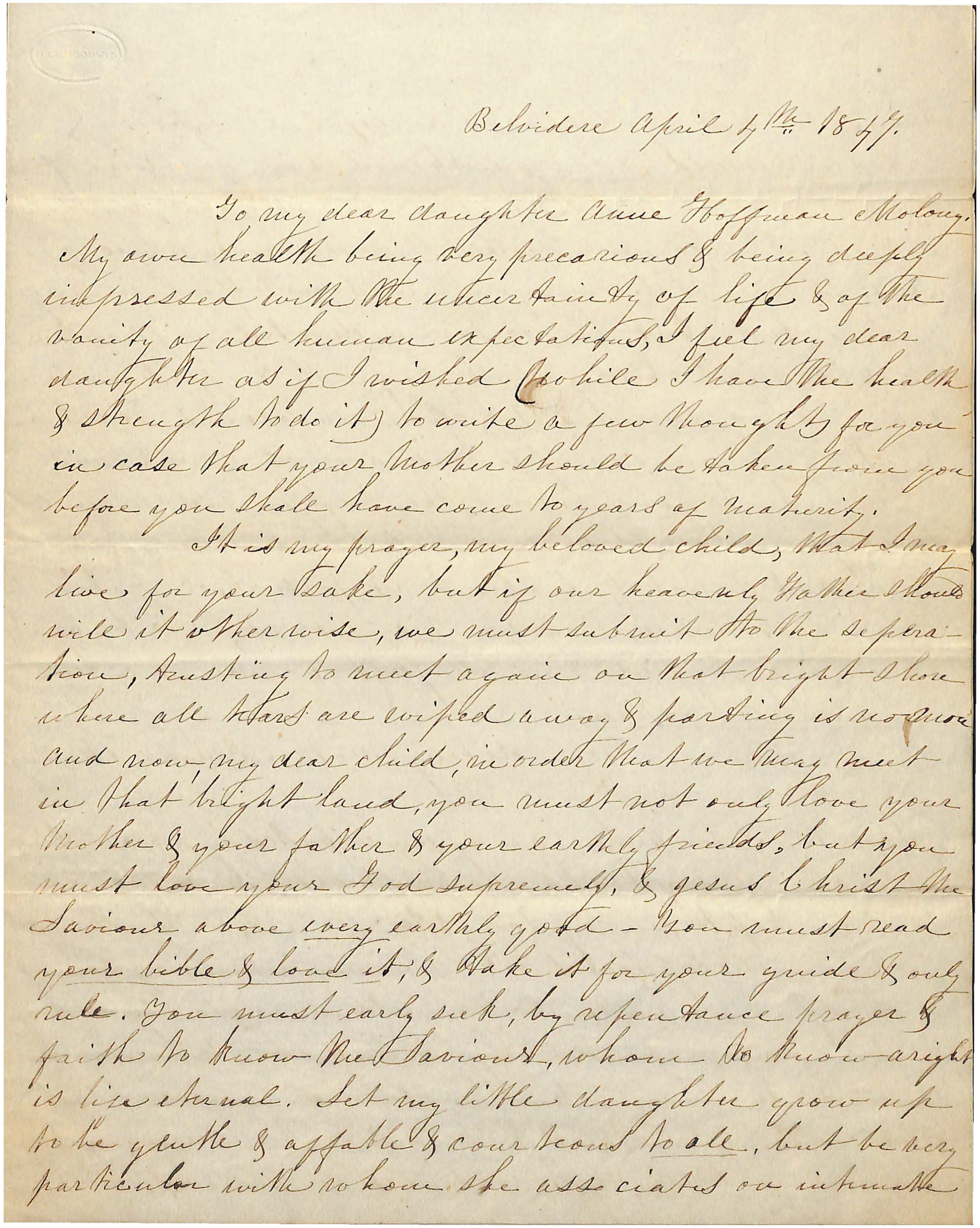 To my dear daughter Anne Hoffman Malony / My own health being very precarious & being deeply / impressed with the uncertainty of life & of the / vanity of all human expectations, I feel my dear / daughter as if I wished (while I have the health / and strength to do it) to write a few thoughts for you / in case that your Mother should be take from you / before you shall have some to years of maturity.