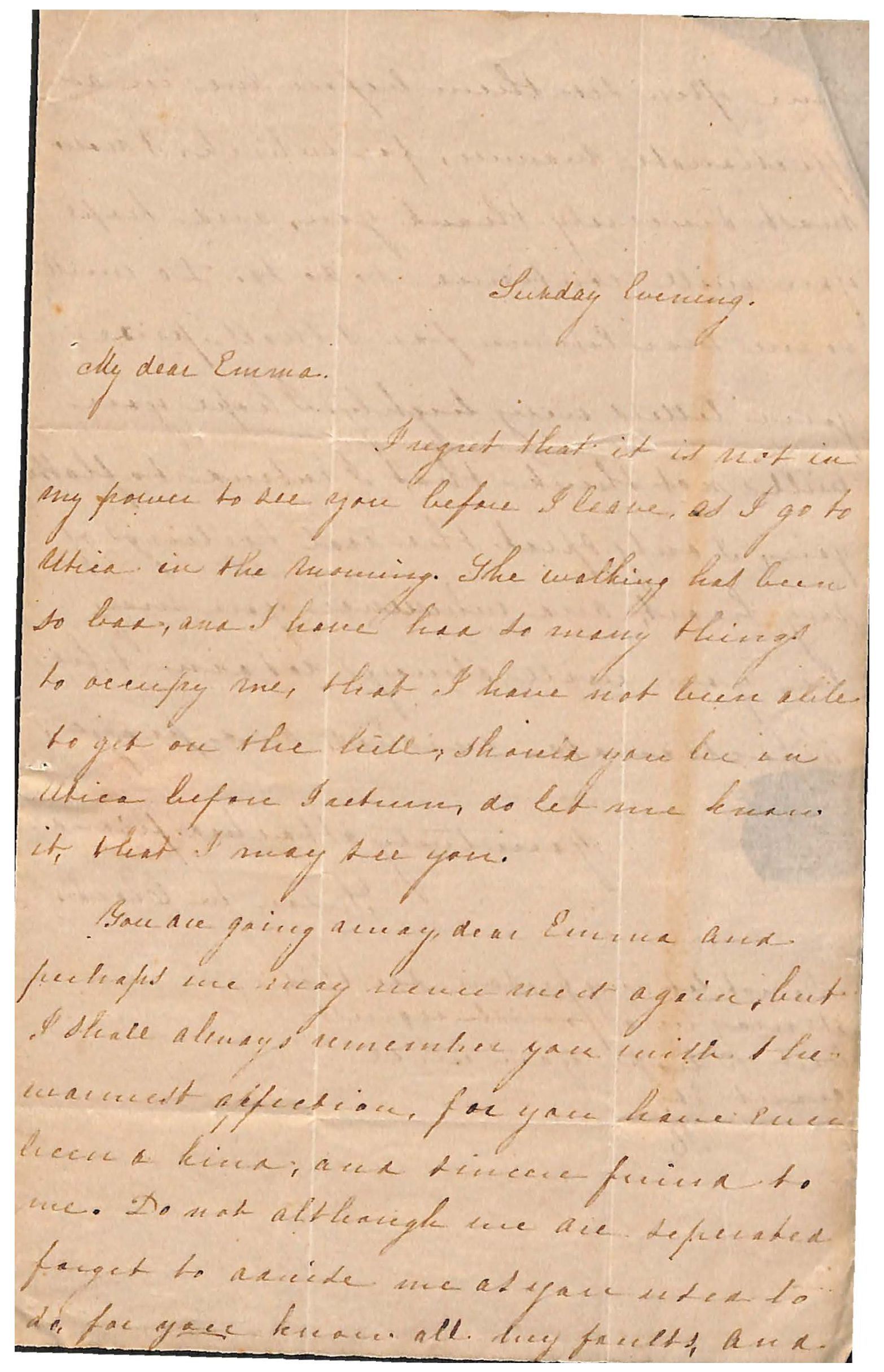 You are going away dear Emma and / perhaps we may never meet again, but / I shall always remember you with the / warmest affection, for you have ever / been a kind, and sincere friend to / me. Do not although we are seperated [sic] / forget to advise me as you used to / do for you know all my faults and