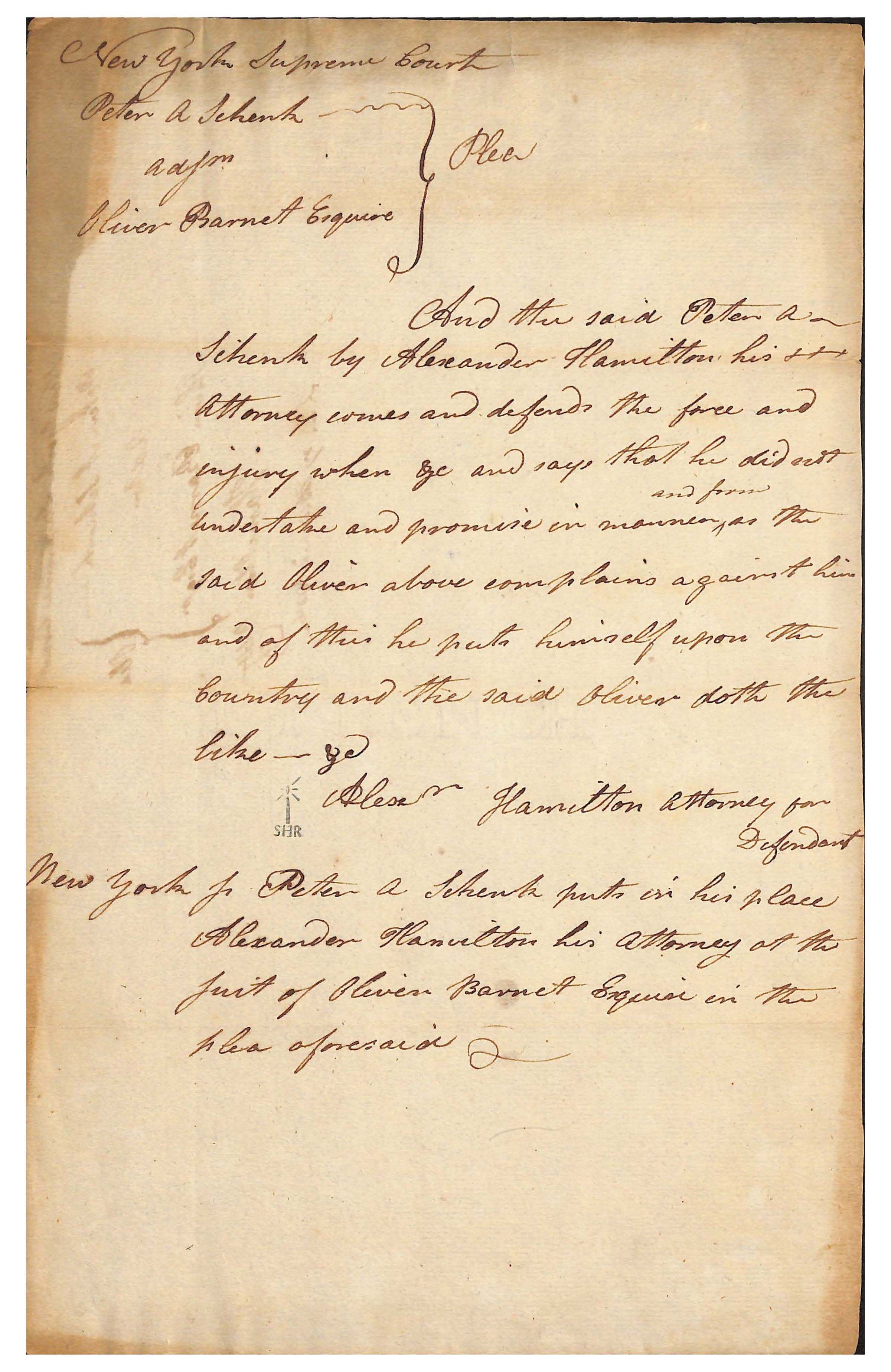 New York [?r.] Peter A. Schenk puts in his place / Alexander Hamilton his attorney at the / suit of Oliver Barnett Esquire in the / plea aforesaid _