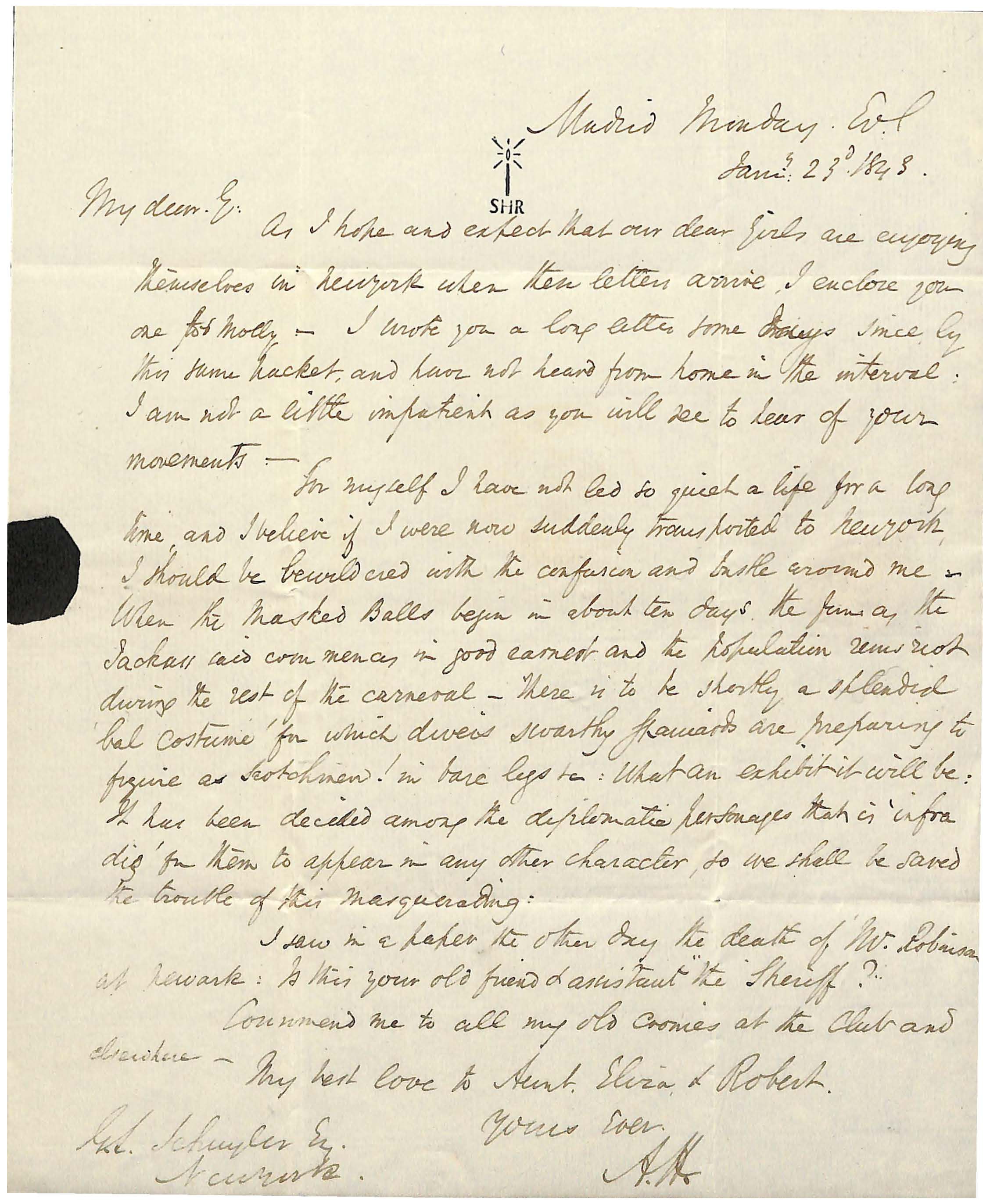 For myself I have not led so quiet a life for a long / time, and I believe if I were now suddenly transported to New York, / I should be bewildered with the confusion and bustle around me _ / When the Masked Balls begin in about ten days. The fun as the / Jackass said commences in good earnest and the population runs riot / during the rest of the carneval _ There is to be shortly a splendid / ‘bal costume’ for which divers swarthy Spaniards are preparing to / figure as Scotchmen! In bare legs +c. What an exhibit it will be: / It has been decided among the diplomatic personages that is [“infra / diz”?] for them to appear in any other character, so we shall be saved / the trouble of this masquerading: