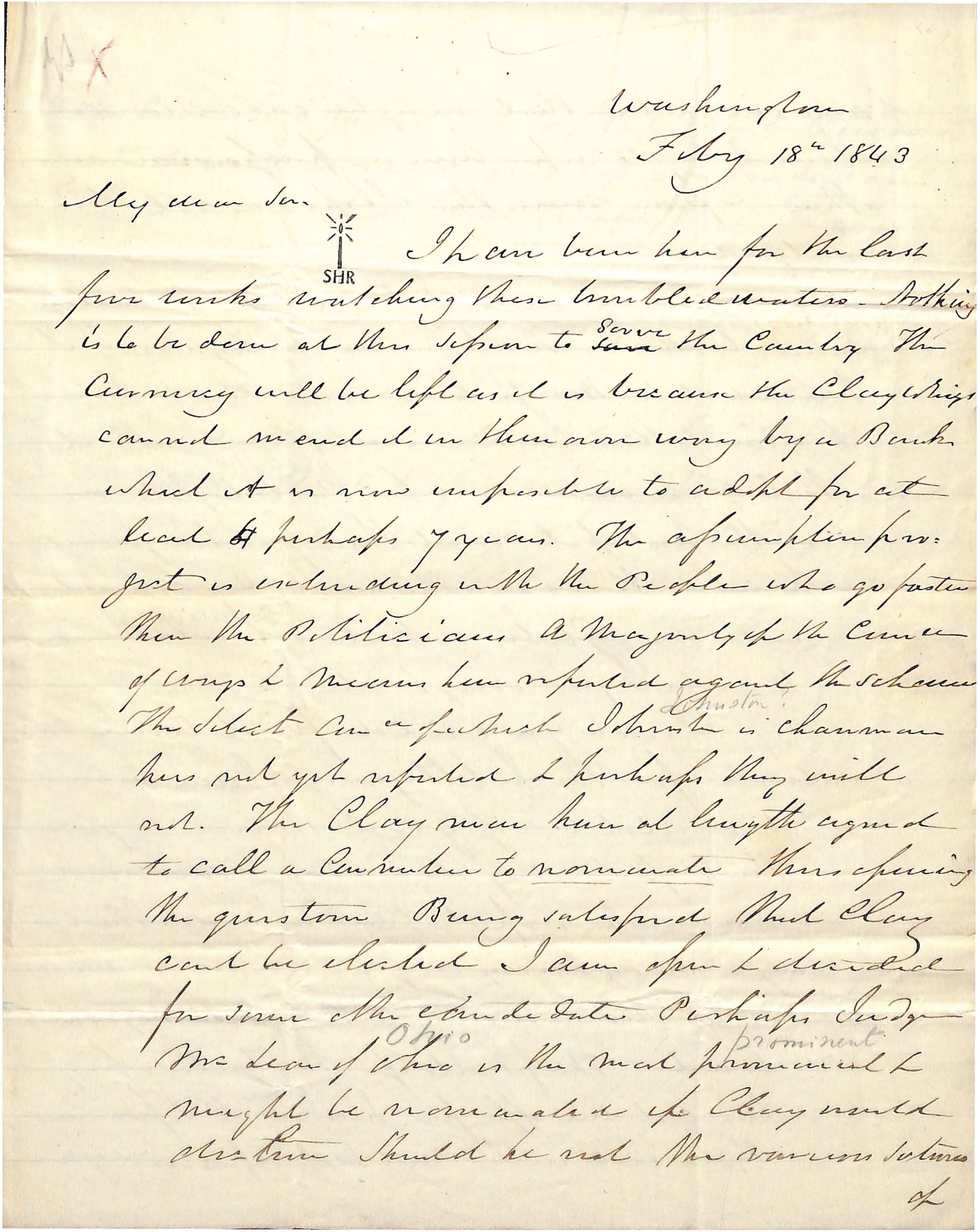I have been here for the last / five weeks watching these troubled waters _ Nothing / is to be done at this session to save [^ serve] the Country. The / currency will be left as it is because the Clay Whigs / cannot [mend? &?] in there own way by a Bank / which it is now im;possible to adopt for at / least 8 perhaps 7 years. The afsumptive pro: / [ject?] is intruding with the People who go faster / than the Politicians A Majority of the [Cmmee - “committee”] / of Ways & Means have [reported?] against the scheme / The Select Cmee of which Johnston is chairman / has not yet reported & perhaps they will / not. The Clay men have at length argued / to call a Committee to nominate thus opening / the question Being satisfied that Clay / can’t be elected I am open & decided / for some other candidate Perhaps Judge / Mr. Lear of Ohio is the most prominent & / might be nominated if Clay would / [?? ?? unrecovered, illegible] should be not the various [?sutnurs?Senators? / of