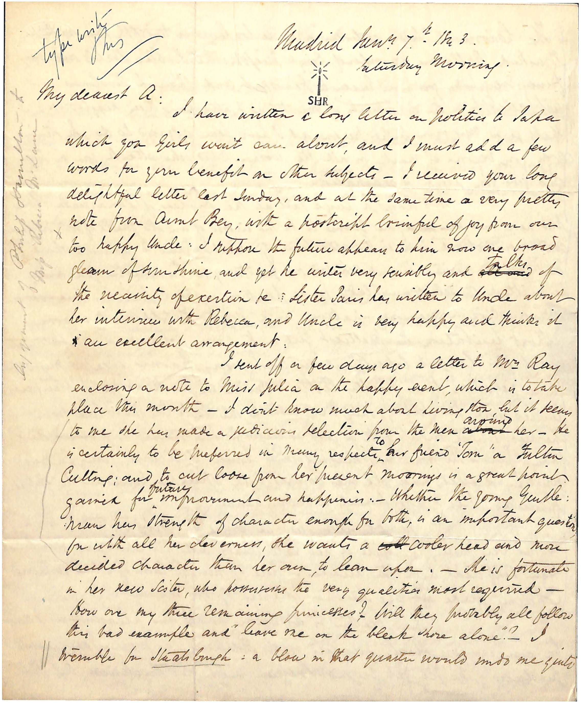 I have written a long letter on politics to Papa / which you Girls won’t care about, and I must add a few / words for your benefit on other subjects _ I received your long / delightful letter last Sunday, and at the same time a very pretty / note from Aunt Be[y?] with a postscript brimful of joy from our / too happy Uncle: I suppose the future appears to him now one broad / gleam of sunshine, and yet he writes very sensibly and and all [^ talks] of / the necessity of exertion +c.: Sister Paris has written to Uncle about / her interview with Rebecca, and Uncle is very happy and thinks it / an excellent arrangement.: