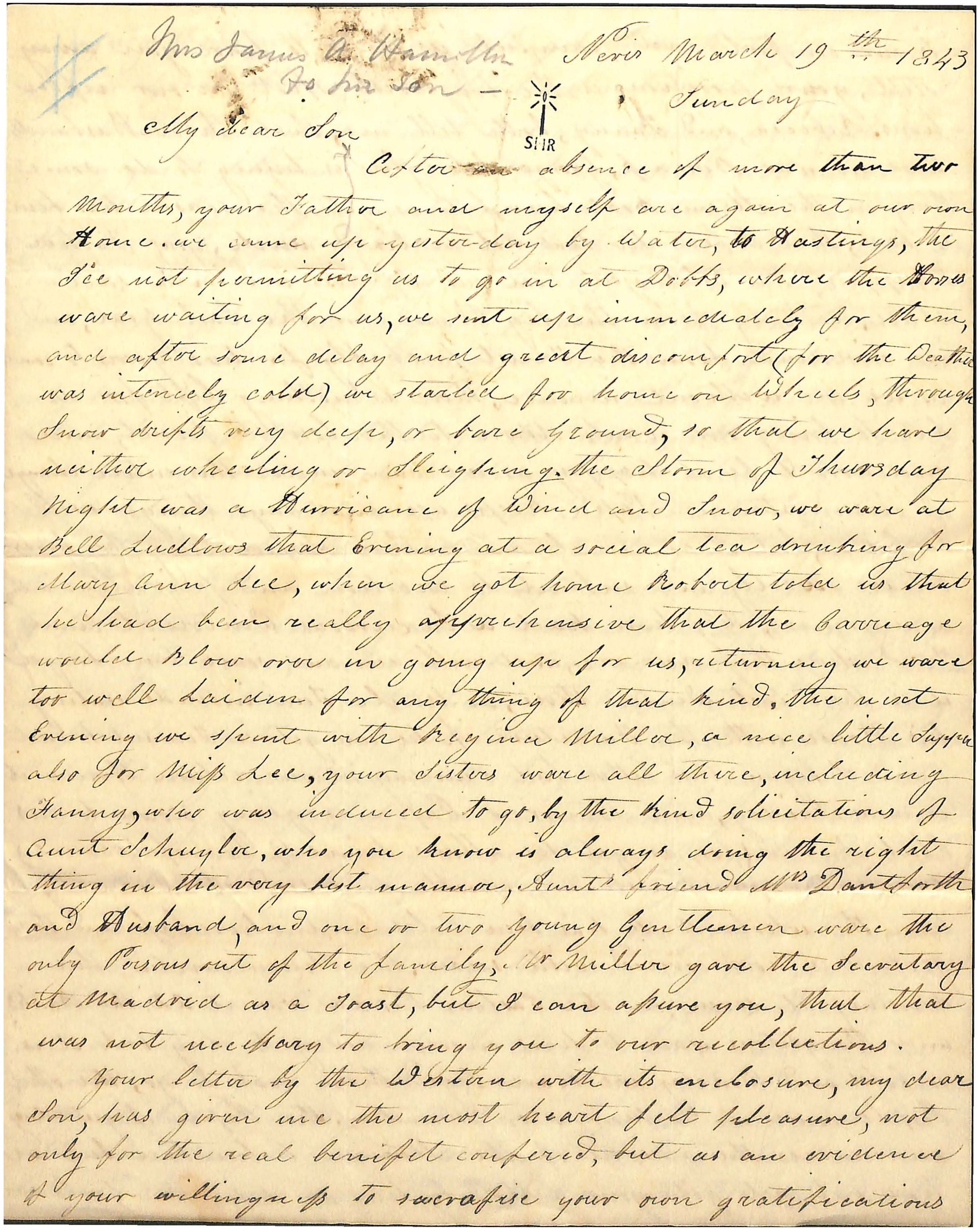 After our absence of more than two / months, your Father and myself are again at our own / House. We came up yesterday by Water, to Hastings, the / Ice not permitting us to go in at Dobbs, where the Horses / ware waiting for us, we sent up immediately for them, / and after some delay and great discomfort (for the weather / was intensely cold) we started for home on Wheels, through / Snow drifts very deep, or bare ground, so that we have / neither wheeling or sleighing. The Storm of Thursday / night was a Hurricane of Wind and Snow, we ware at / Bell Ludlows that Evening at a social tea drinking for / Mary Ann Lee, when we got home Robert told us that / he had been really apprehensive that the Carriage / would Blow over in going up for us, returning we ware / too well Laiden for any thing of that kind. The next / Evening we spent with Regina Miller, a nice little supper / also for Miss Lee, your sisters ware all there, including / Fanny, who was induced to go, by the kind solicitations of / Aunt Schuyler, who you know is always doing the right / things in the very best manner, Aunts friend Mrs Dantforth / and Husband, and one or two young Gentlemen ware the / only Persons out of the family, Mr. Miller gave the Secretary / at Madrid as a toast, but I can assure you, that that / was not necessary to bring you to our recollections.