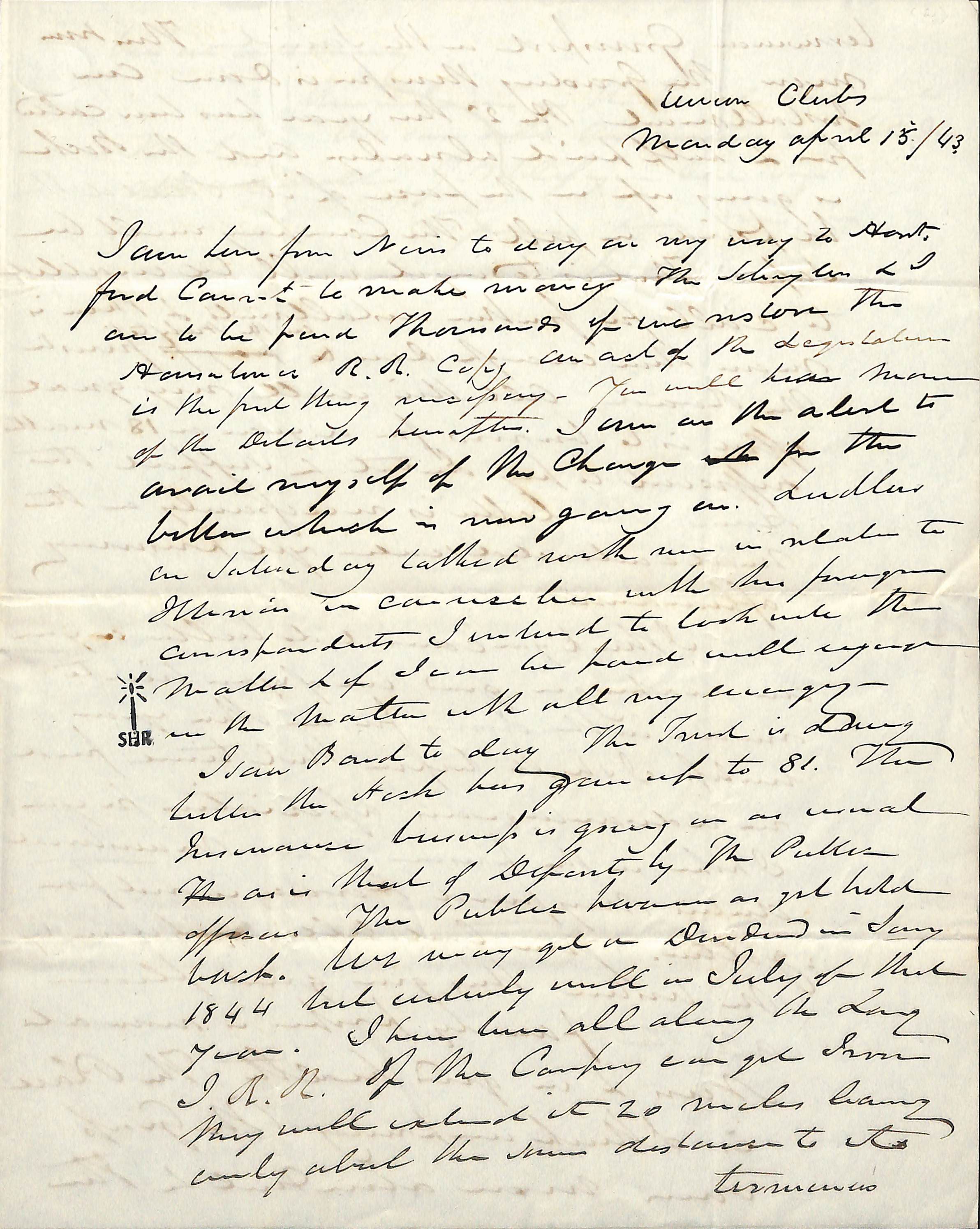 I am here from Nevis to day on my way to Hart. / ford Conn’t to make money The Schuylers + I / are to be paid thousands if we [restore?] the / [Harrisburg?] R.R. Cmpy An act of the Legislature / is the first thing necessary _ You will hear more / of the Details hereafter. I am on the alert to / avail myself of the change in for the / better which is now going on. Ludlow / on Saturday talked with me in relation to / [Morris?] and can use him with his foreign / correspondents I intend to look into the / matter + if I can be part will engage / in the matter with all my energy _ /