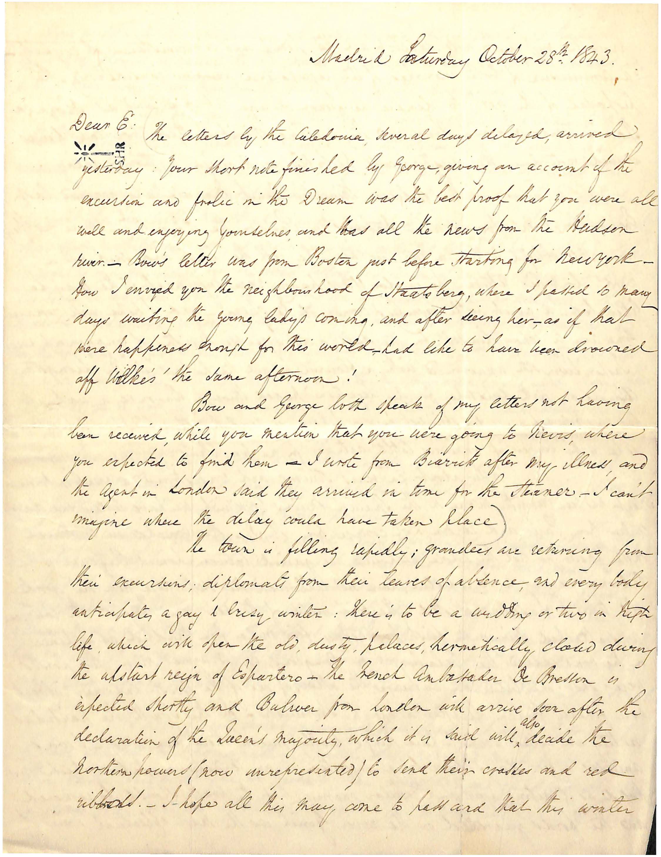The town is filling rapidly; grandees are returning from / their excursions; diplomats from their leaves of absence, and every body / anticipates a gay + busy winter: There is to be a wedding or two in high / life, which will open the old, dusty palaces, hermetically closed during / the upstart reign of Espartero _ The French Ambassador De Bresson is / expected shortly and Bulwer from London will arrive soon after the / declaration of the Queen’s majority, which it is said will [^ also] decide the / northern powers, (now unrepresented) to send their crosses and red / ribbons. _ I hope all this may come to pass and that this winter /