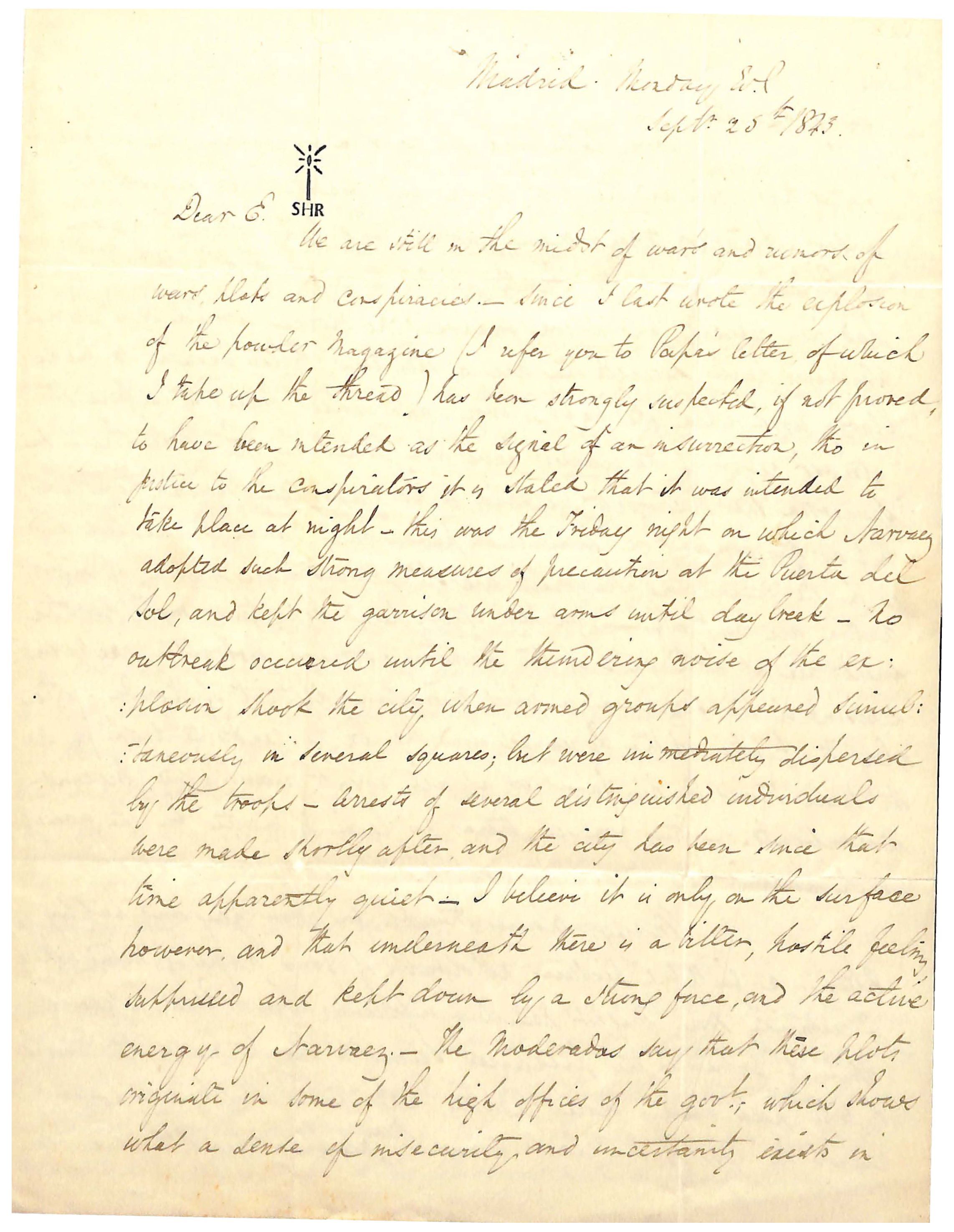 We are still in the midst of war’s and rumors of / wars, plots and conspiracies _ since I last wrote the explosion / of the powder magazine (I refer you to Papa’s letter of which / I take up the thread) has been strongly sustemd, if not proved, / to have been intended as the signal of an insurrection, tho in / justice to the conspirators it is stated that it was intended to / take place at night _ this was the Friday night on which Narvaez / adopted such strong measures of precaution at the Puerta del / Sol, and kept the garrison under arms until day break _ No / outbreak occurred until the thundering noise of the ex - / plosion shook the city when armed groups appeared simul - / taneously in several squares; but were immediately dispersed / by the troops _ arrests of several distinguished individuals / were made shortly after, and the city has been since that / time apparently quiet _ I believe it is only on the surface / however and that underneath there is a bitter, hostile feeling / suppressed and kept down by a strong force, and the active / energy of Narvaez _ The Moderados say that these plots / originate in some of the high offices of the gov’t, which shows / what a sense of insecurity and uncertainty exists in /