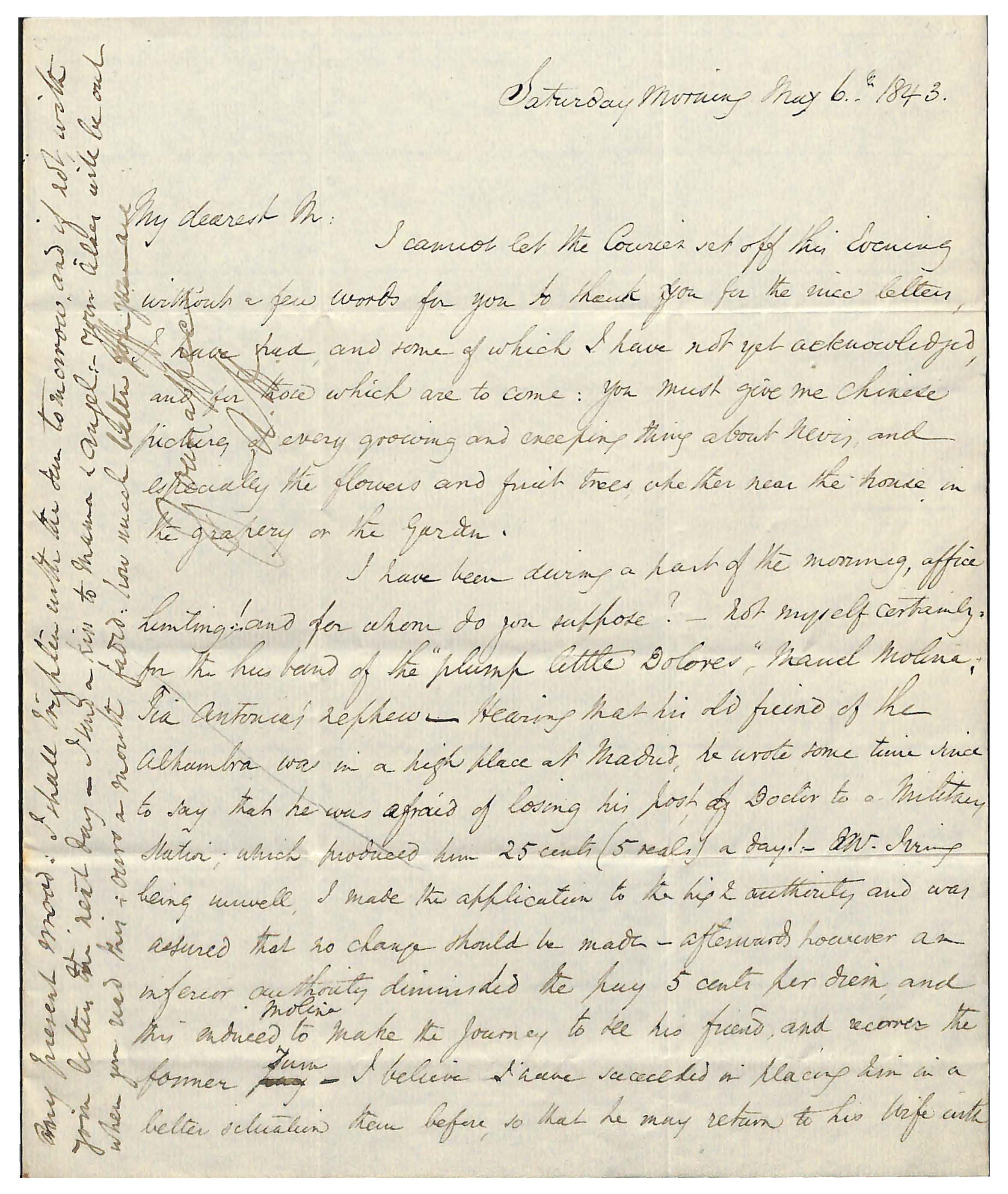 I have been during a part of the morning, office / hunting! And for whom do you suppose? _ not myself certainly : / for the husband of the “plump little Dolores”, Maud Molina, / Tia Antonia’s nephew _ hearing that his old friend of the / Alhambra was in a high place at Madrid, he wrote some time since / to say that he was afraid of losing his post, as Doctor to a military / station; which produced him 25 cents (5 reals) a day! _ Mr. Irving / being unwell, I made the application to the high authority and was / assured that no change should be made _ afterward however an / inferior authority diminished the pay 5 cents per diem, and / this induced [^ Molina] to make the journey to see his friend, and recover the / former pay [Z–?] _ I believe I have succeeded in placing him on a / better situation then before, so that he may return to his wife with /