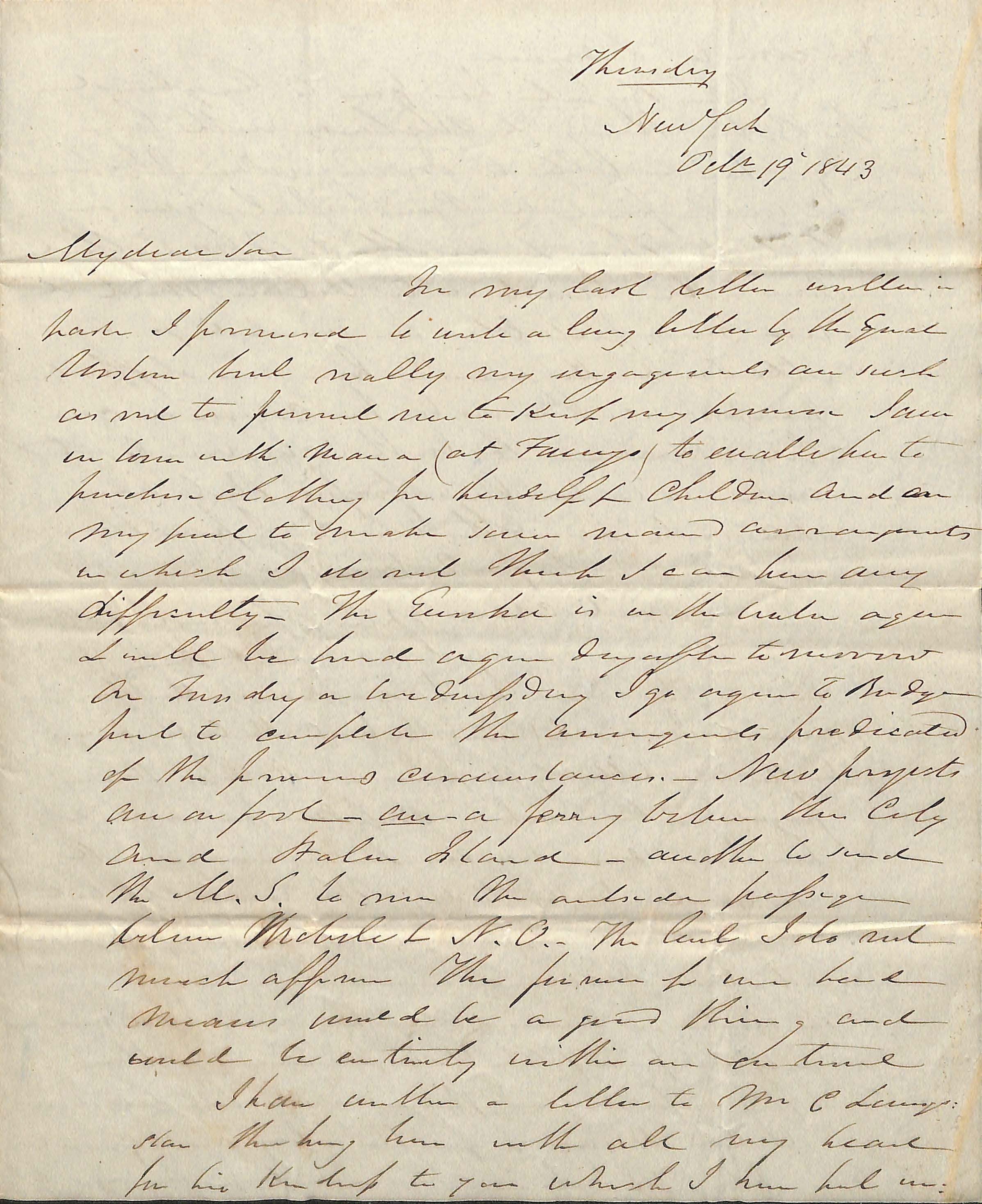 In my last letter written in / haste I presumed to write a long letter by the Great / Western but really my engagements are such / as not to permit me to Keep my promise I am / in town with Mama (at Fannys) to enable her to / purchase clothing for herself + children and am / my [point?] to make some [??] arrangements / in which I do not Think I can have any / difficulty _ the Eureka is on the water again / + will be [??] any day after tomorrow / on Tuesday or Wednesday I go again to Bridge - / port to complete the arrangements predicated / of the previous circumstances _ New projects / are on foot _ are a ferry between the City / and Staten Island _ another to send / the U.S. to run the outside passage / between Mobile + N.O. The last I do not / much approve the former [for [our] [hard] / means could be a good thing and / could be entirely within an [??t?].