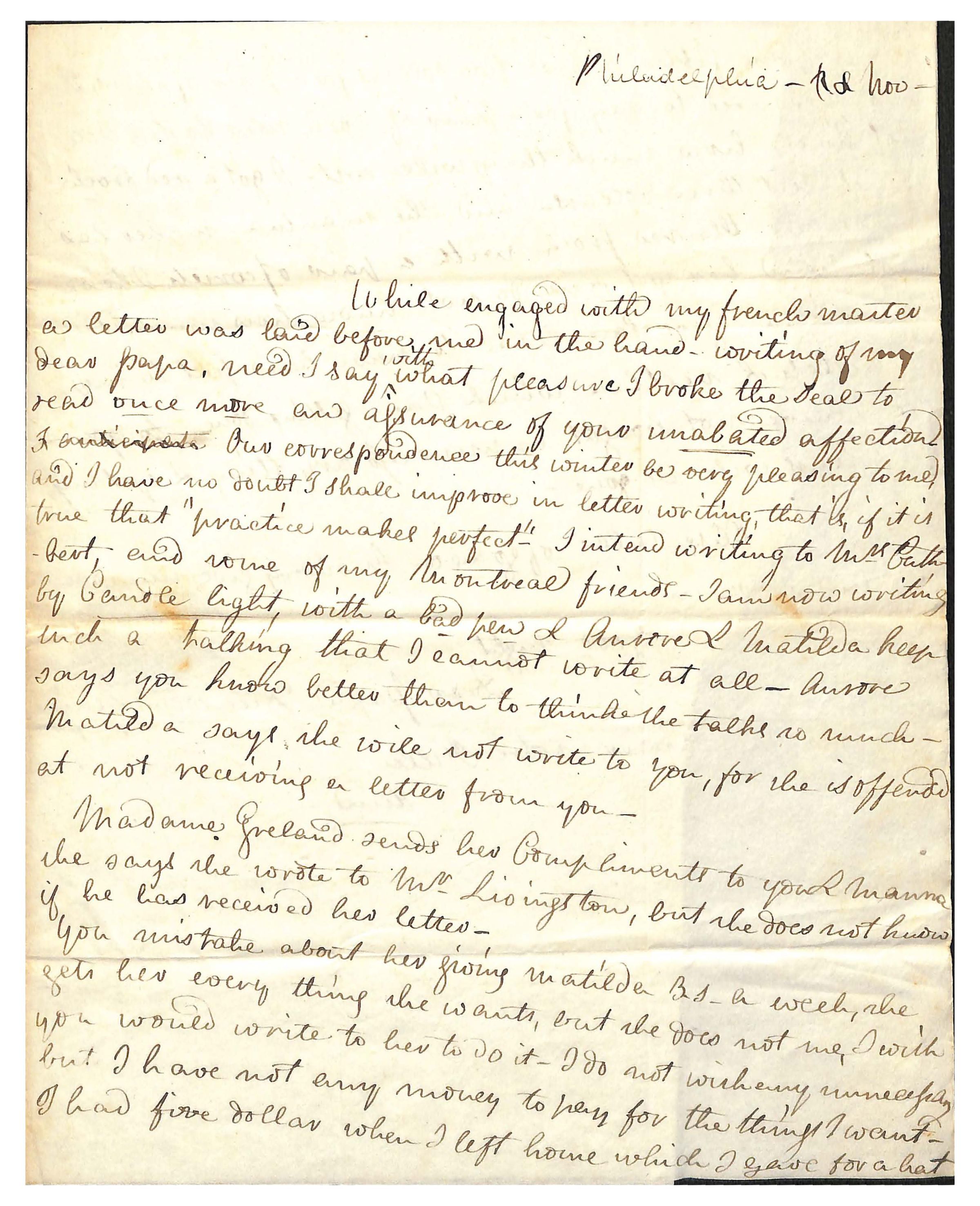 While engaged with my french master / a letter was laid before me in the hand-writing of my / dear Papa, need I say [inserted: with] what pleasure I broke the seal to / read once more an assurance of your unabated affection / I anticipate Our correspondence this winter be very pleasing to me / and I have no doubt I shall improve in letter writing that is, if it is/ true that “practice makes perfect-” I intend writing to Mrs. Cuth - / bert and some of my Montreal friends- I am now writing / by candlelight, with a bad pen & [Aurore] & Matilda keep / such a talking that I cannot write at all _ Aurore / says you know better than to think she talks so much- / Matilda says she will not write to you, for she is offended / at not receiving a letter from you-
