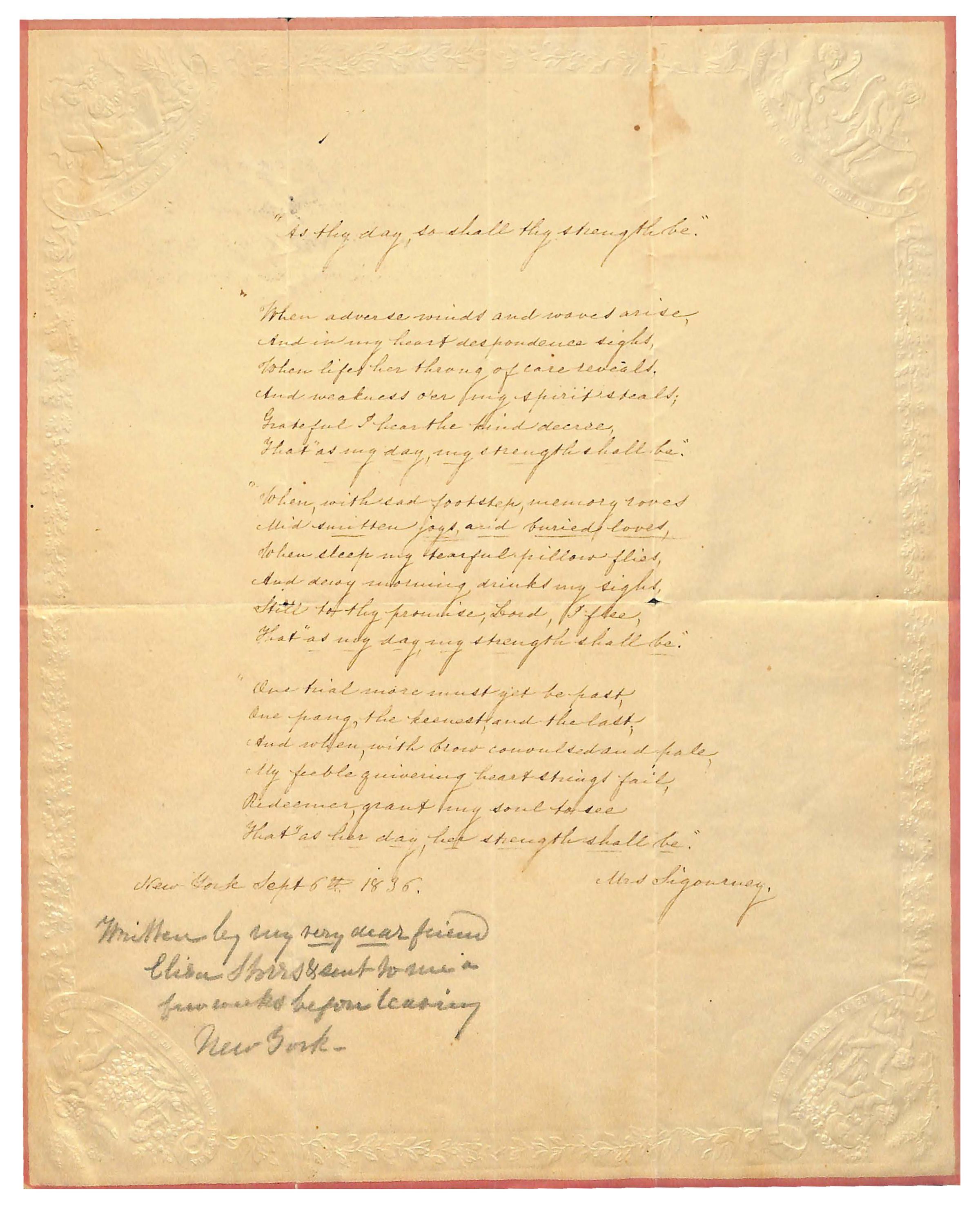 New York Sept 6th 1836. Mrs. Sigourney