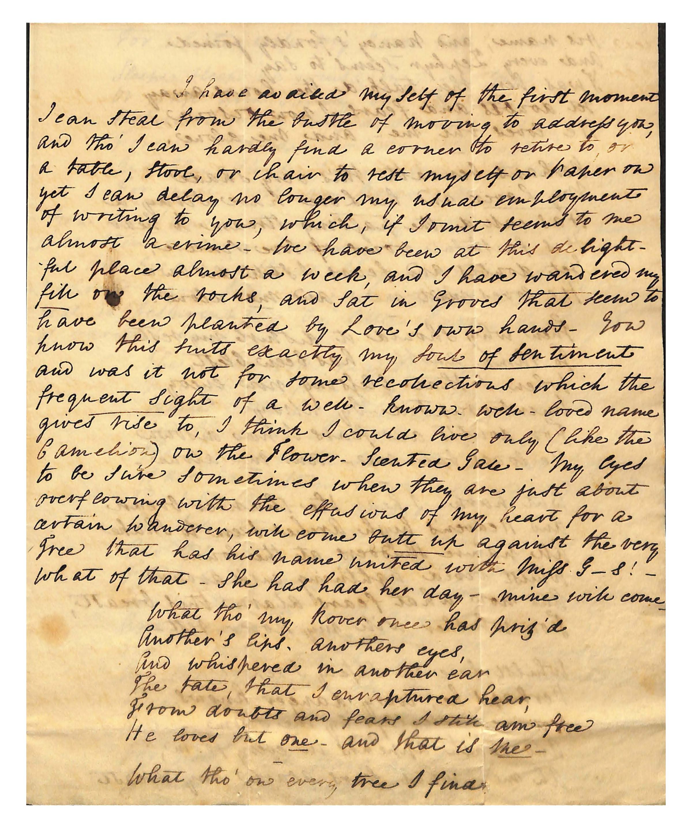 I have availed myself of the first moment / I can steal from the bustle of moving to address you, / and tho’ I can hardly find a corner to retire to, or / a table, stool, or chair to rest myself or paper on / yet I can delay no longer my usual employment / of writing to you, which, if I omit seems to me / almost a crime _ We have been at this delight - / ful place almost a week, and I have wandered my / fill on the rocks, and Sat in Groves that seem to / have been planted by Love’s own hands _ You / know this suits exactly my soul of sentiment / and was it not for some recollections which the / frequent sight of a well - known, well - loved name / gives rise to, I think I could live only (like the / Camelion) on the Flower - scented Gale _ My eyes / to be sure sometimes when they are just about / overflowing with the effusions of my heart for a / certain wanderer, will come butt up against the very / Tree that has his name unite wth Miss G ___ S! ___ / What of that _ She has had her day _ mine will come _