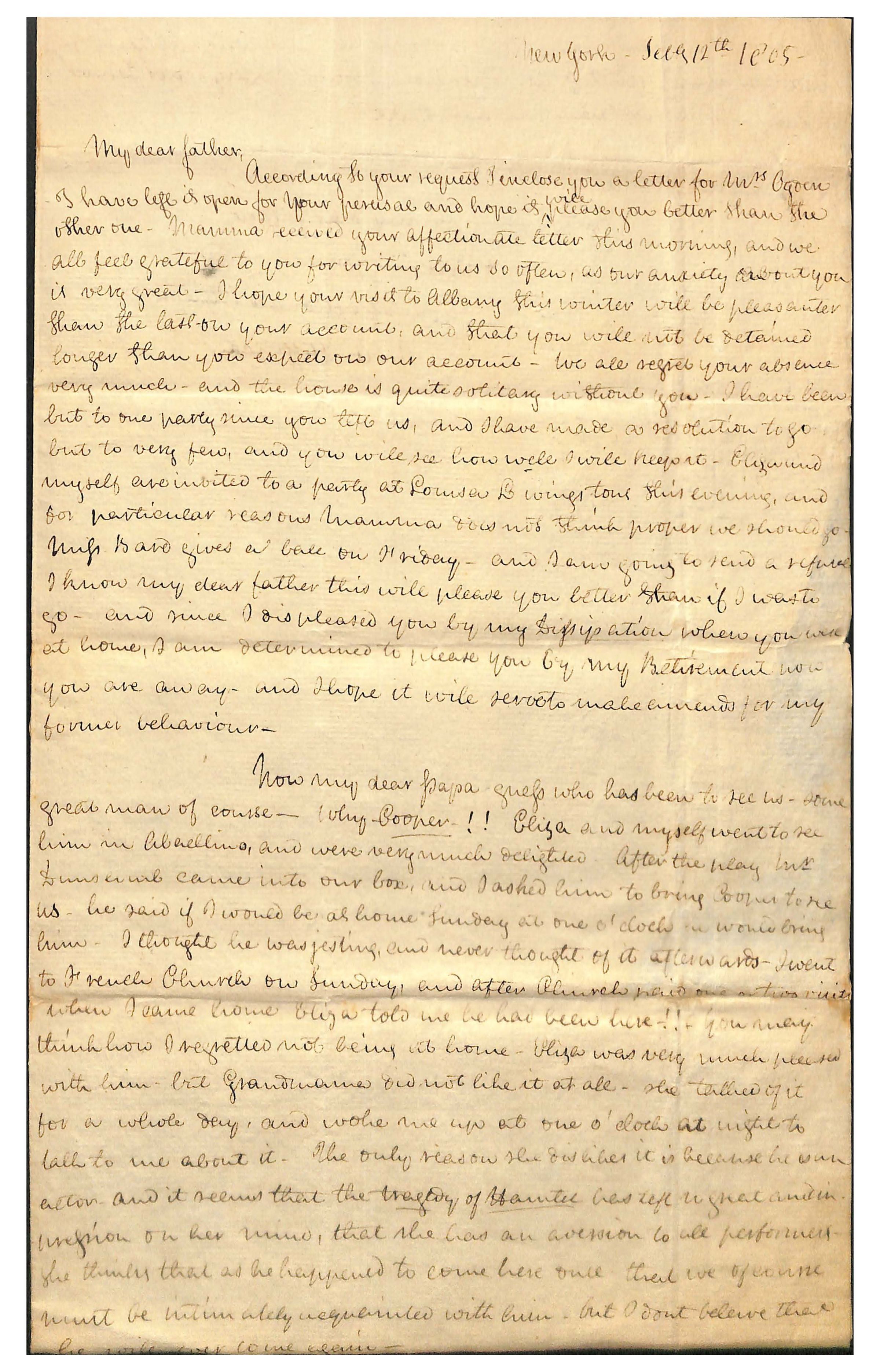 Now my dear Papa guess who has been to see us- some/ great man of course- why - Cooper!! Eliza and myself went to see/ him in Abaellino, and were very much delighted After the play Mr/ D[unrecovered] came into out box, and I asked him to bring Cooper to see/ us- he said if I would be at home Sunday at one o’clock he would bring/ him- I thought he was jesting, and never thought of it afterwards- I went/ to French Church on Sunday, and after Church paid one or two visits/ when I came home Eliza told me he had been here!! You may/ think how I regretted not being at home- Eliza was very much pleased/ with him- but Grandmama did not like it at all- she talked of it/ for a whole day, and woke me up at one o’clock at night to/ talk to me about it- The only reason she disliked it is because he is an/ actor and it seems that the tragedy of Hamlet has left so great an im-/ -pression on her mind, that she has an aversion to all performers-/ she thinks that as he happened to come here once that we of course/ must be intimately acquainted with him- but don’t believe that/ he will ever come again-/