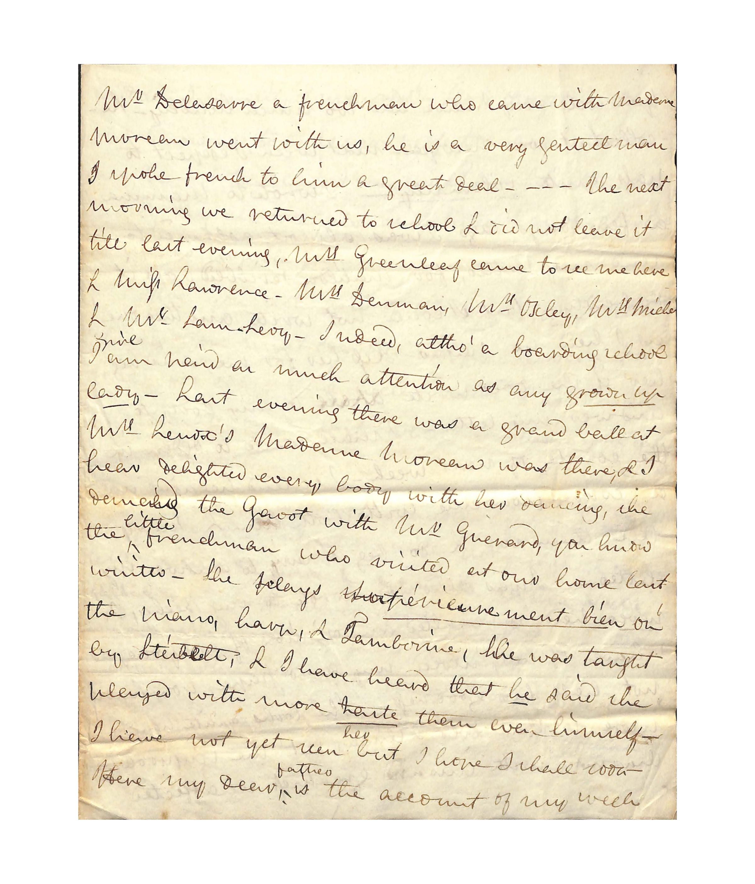 Mr. [Delasavre] a frenchman who came with Madame/ Moreau went with us, he is a very gentleman/ I wrote french to him a great deal - - - - The next/ morning we returned to school & did not leave it/ till last evening, Mrs. Greenleaf came to see me here/ & Miss. Lawrence - Mrs Dennan, Mrs Oscley, Mrs [Miche]/ & Mr Lam-Levy - I indeed, altho’ a boarding school/ I [unrecovered] am paid as much attention as any grown up/ lady- Last evening there was a grand ball at/ Mrs Lenox’s Madame Moreau was there, & I/ hear delighted every body with her dancing, she/ danced the Gavot with Mr. Guerard, you know/ the little frenchman who visited at our home last/ winter- She plays [unrecovered words] on/ the piano, tambourine, he was taught by L[unrecovered] & I have heard that he said she/ played with more harte than even himself-/ I have not yet seen [inserted: her] but I hope I shall soon-/ Here my dear [inserted: father] is the account of my week/