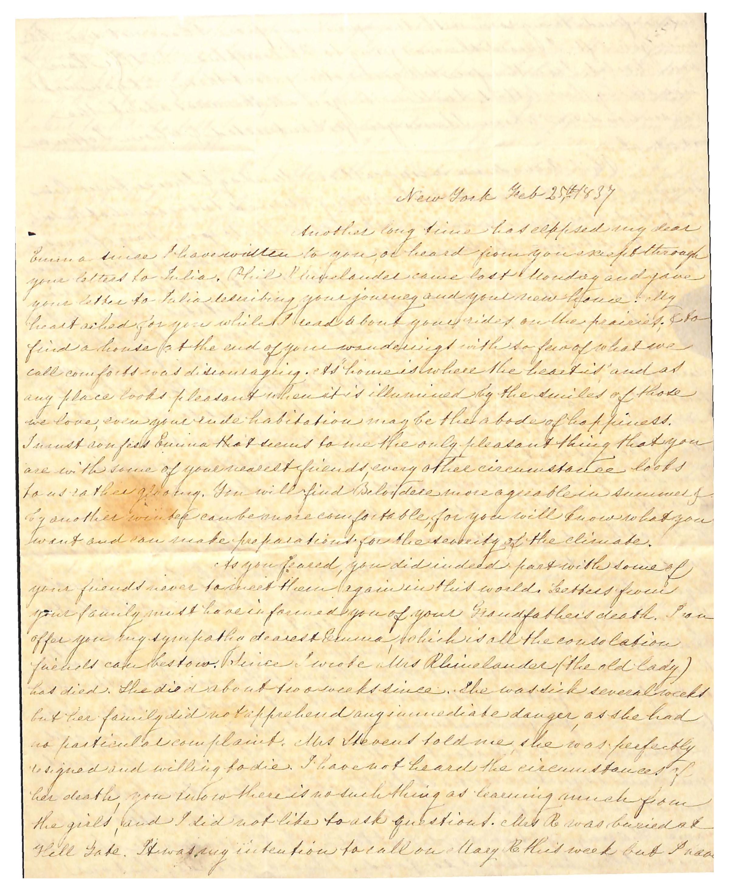 As you feared, you did indeed part with some of / your friends never to meet them again in this world. Letters from / your family must have informed you of your Grandfather’s death. I can / offer you my sympathy dearest Emma which is all the consolation / friends can bestow. Since I wrote Mrs. Rhinelander (the old lady) / has died. She died about two weeks since. She was sick several weeks / but her family did not apprehend any immediate danger, as she had / no particular complaint. Mrs Stevens told me she was perfectly / resigned and willing to die. I have not heard the circumstances of / her death, you know there is no such thing as learning much from / the girls, and I did not like to ask questions. Mrs R was buried at / Hell Gate. It was my intention to call on Mary R this week but I have /