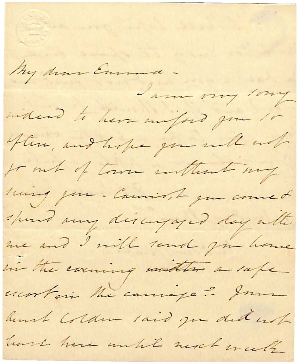 I am very sorry / indeed to have missed you so / often, and hope you will not / go out of town without my / seeing you _ Cannot you come + / spend any disengaged day with / me and I will send you home / in the evening with a safe / escort in the carriage? Your / Aunt Colden said you did not / leave here until next week /