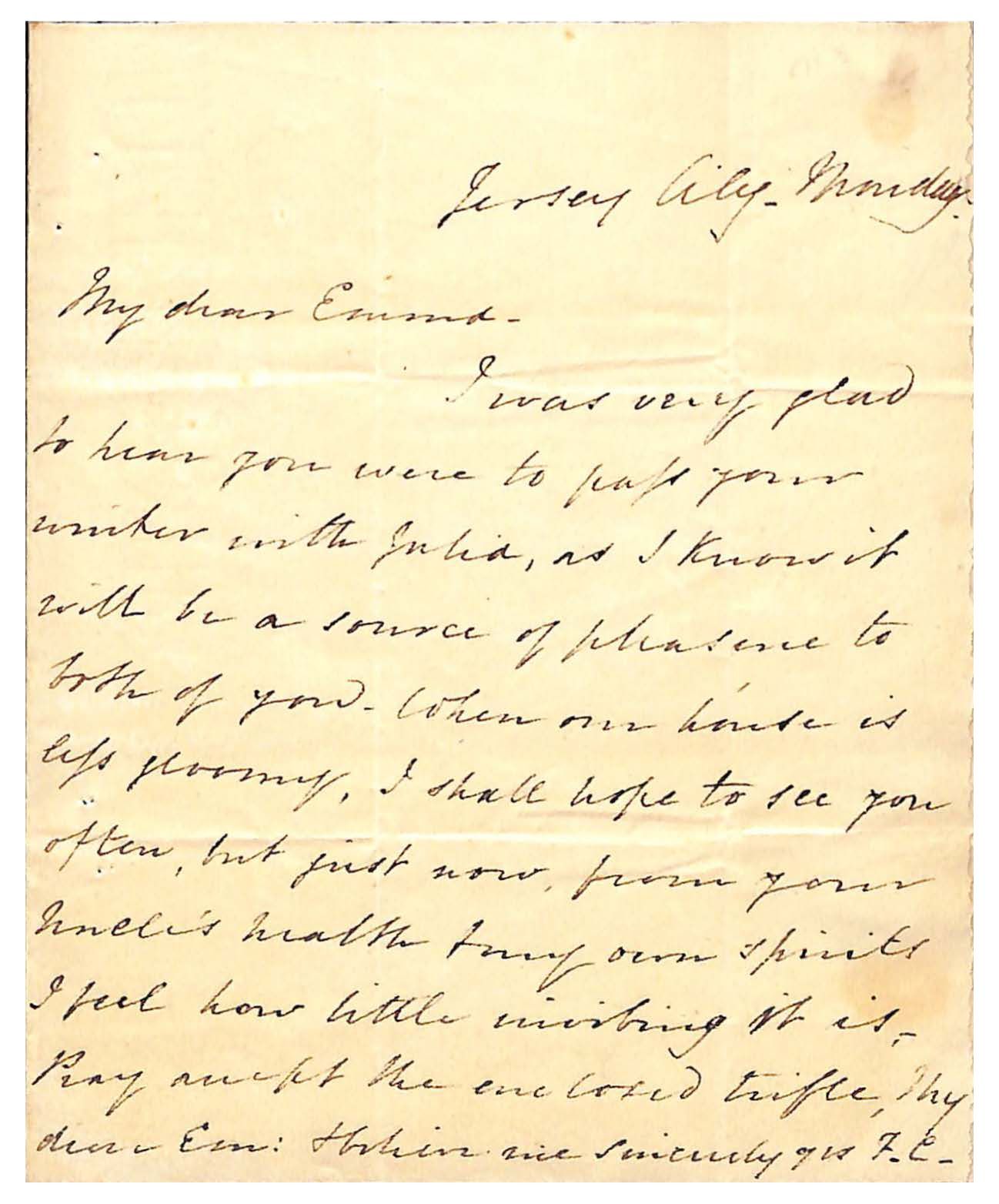 I was very glad / to hear you were to pass your / winter with Julia, as I know it will be a source of pleasure to both of you. When our house is less gloomy, I shall hope to see you / often, but just now from your / Uncle’s health + my own spirits / I feel how little inviting it is _ / Pray accept the enclosed trifle, my / dear Em: + believe me sincerely yrs F. C.Other Names and Numbers