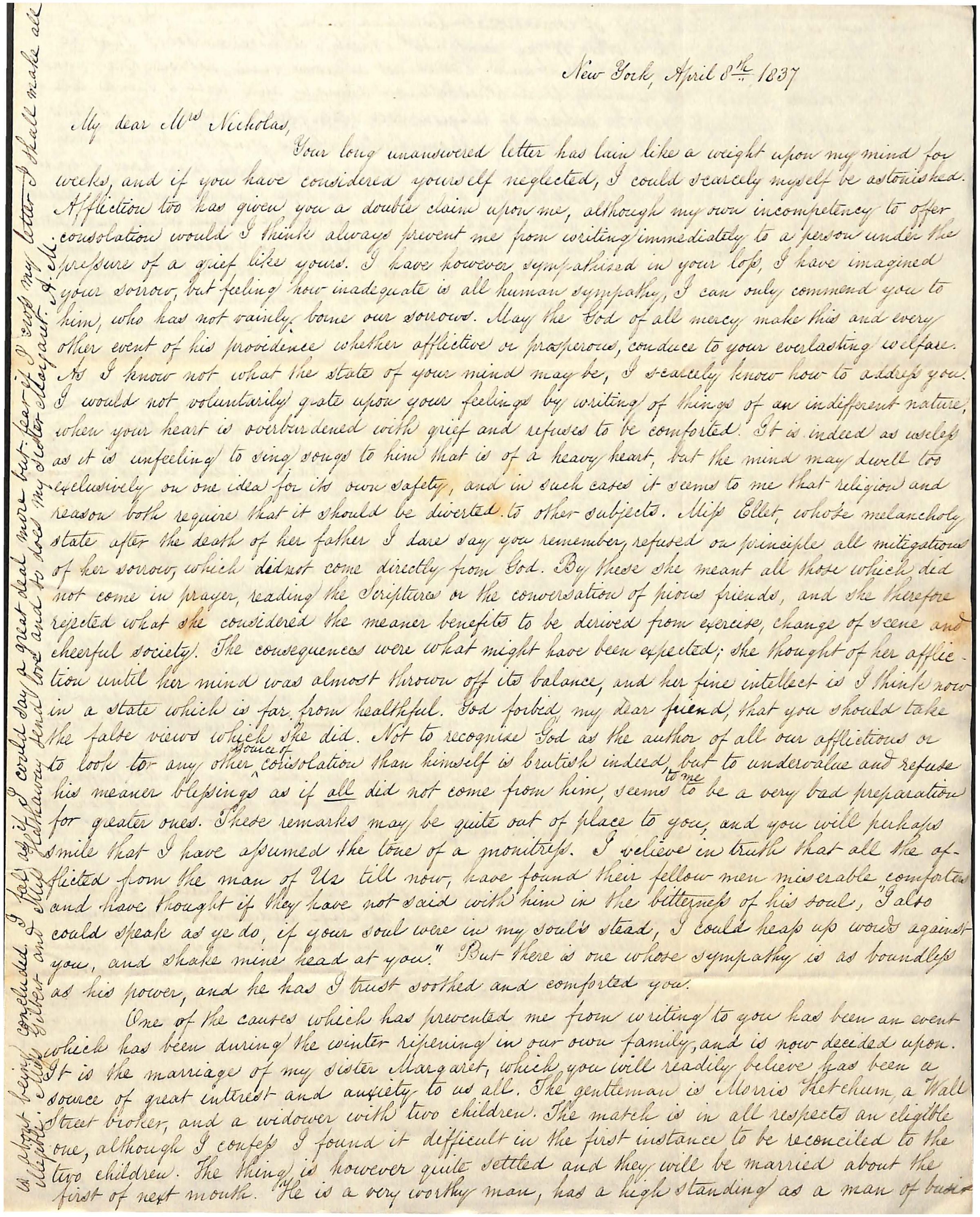 ness, and is even in these days of commercial distress a man of fortune. As we have/ long known him, being a brother of my aunt Mrs [Akerly]. I have no doubt that he/ will make Margaret an excellent husband. He is not a pious man, although a man/ of very serious views goes regularly to a Presbyterian church, and will I think exer-/cise a happy influence on the subject of religion over Margarets mind. She seems/ herself to be deeply impressed with the responsibilities she is going to assume, and/ says that she feels deeply the want of higher motives and principles than have ever acc-/tuated her before. I cannot help entertaining a very stong hope that they will both decide to be Christians. The loss of Georgre and the fear that he may not be happy is the most pain-/ful part of the matter. His birth in our house, and the death of his father in his early infancy/ have given me feelings of great tenderness towards him. I shall feel the separation/ from him very severely, but God knows what is best both for him and for me. Margaret/ will leave home as soon as she is married. Mr Ketchum lives in East Broadway where/ he is has a fine house, but I hope in another year we may be nearer to her than we shall be at first./