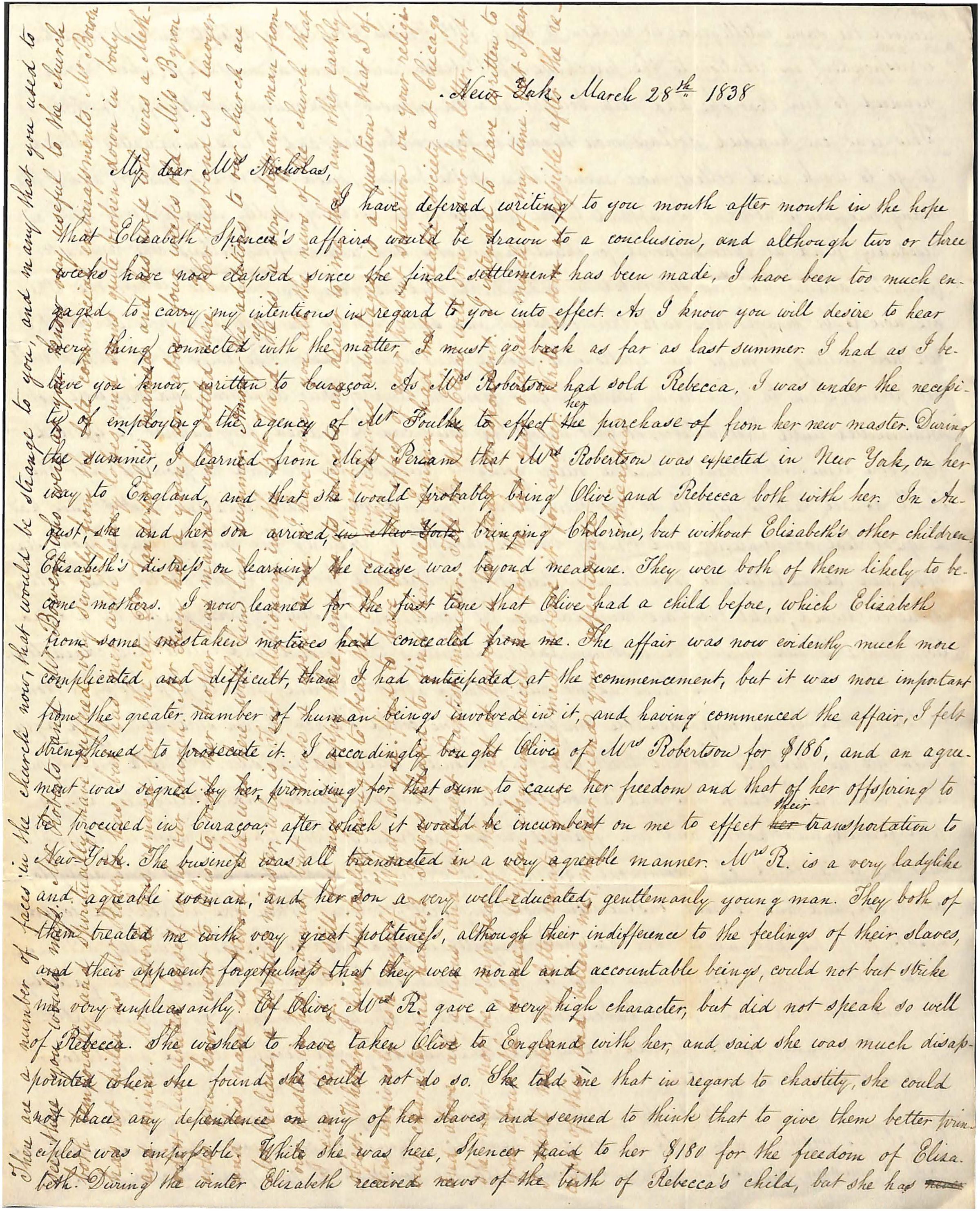 I have deferred writing to you month after month in the hope / that Elisabeth Spencer’s affairs would be drawn to a conclusion, and although two or three / weeks have now elapsed since the final settlement has been made, I have been too much en- / gaged to carry my intentions in regard to you into effect. As I know you will desire to hear / every thing connected with the matter, I must go back as far as last summer. I had as I be- / lieve you know written to Curaçao . As Mrs Robertson had sold Rebecca, I was under the necessi- / ty of employing the agency of Mr Foulk to effect her purchase from her new master. During / the summer, I learned from Miss Periam that Mrs Robertson was expected in New York, on her way to England, and that she would probably bring Olive and Rebecca both with her. In Au- / gust, she and her son arrived in New York bringing Chlorine, but without Elisabeth’s other children. Elisabeth’s distress on learning the cause was beyond measure. They were both of them likely to be- / come mothers. I now learned for the first time that Olive had a child before, which Elisabeth / from some mistaken motives had concealed from me. The affair was now evidently much more / complicated and difficult, than I had anticipated at the commencement, but it was more important / from the greater number of human beings involved in it, and having commenced the affair, I felt / strengthened to prosecute it. I accordingly bought Olive of Mrs Robertson for $186, and an agree-/ment was signed by her promising for the sum to cause her freedom and that of her offspring to / be procured in Curaçao after which it would be incumbent on me to effect their transportation to / New York. The business was all transacted in a very agreable manner. Mrs R is a very ladylike / and agreable woman, and her son a very well educated, gentlemanly young man. They both of / them treated me with very great politeness, although their indifference to the feelings of their slaves / and their apparent forgetfulness that they were moral and accountable beings, could not but strike / me very unpleasantly. Of Olive, Mrs R gave a very high character, but did not speak so well / of Rebecca. She wished to have taken Olive to England with her, and said she was much disap- / pointed when she found she could not do so. She told me that in regard to chastity, she could / not place any dependence on any of her slaves and seemed to think that to give them better prin- / ciples was impossible. While she was here, Spencer paid to her $180 for the freedom of Elisa.- / beth. During the winter Elisabeth received news of the birth of Rebecca’s child, but she has [crossed out] /