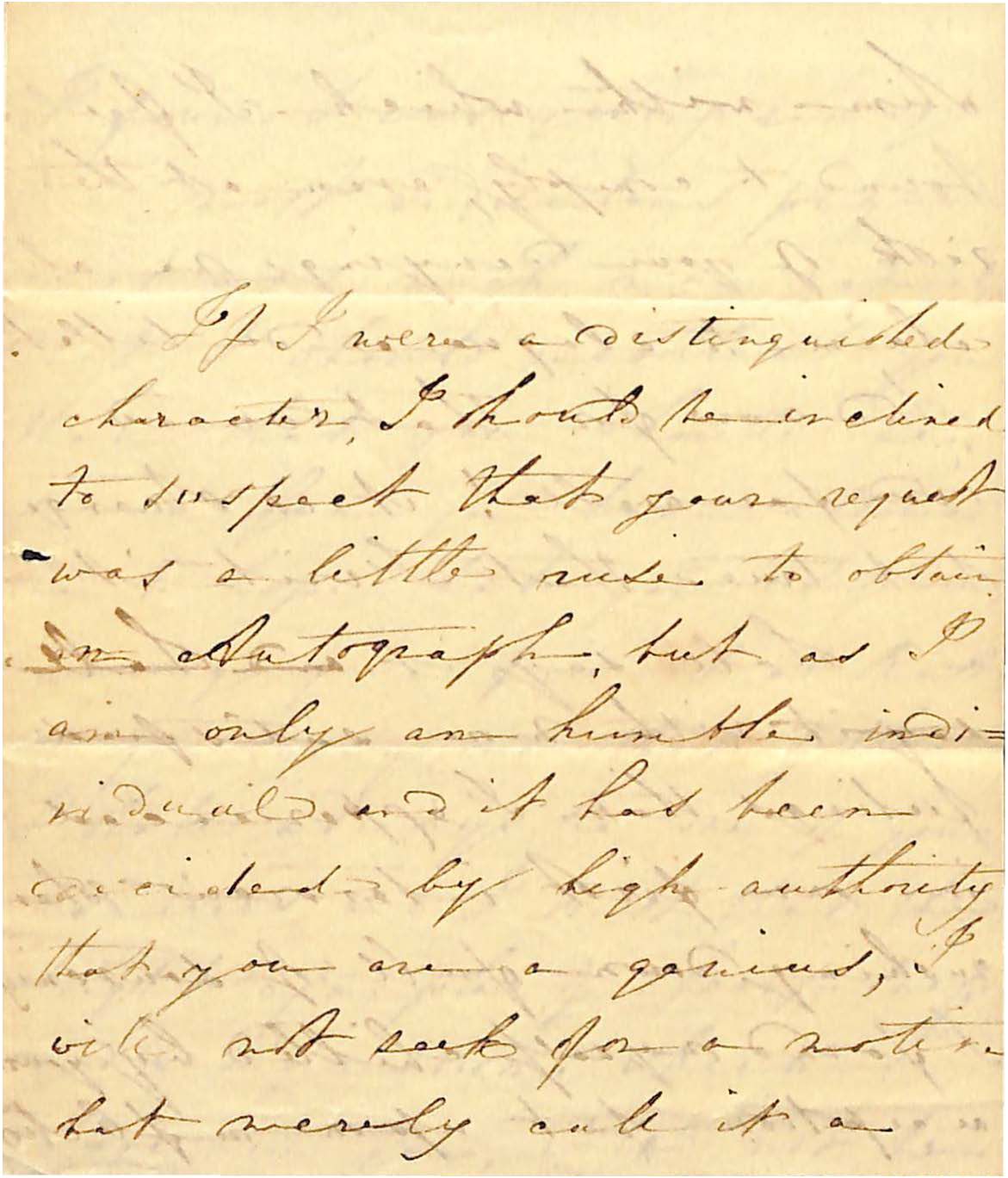 If i were a distinguished/ character I should be inclined/ to suspect that your request/ was a little rude to obtain/ an autograph but as I/ am only an humble indi-/vidual and it has been/ decided by high authority/ that you are a genius, I/ will not seek for a motive/ but merely call it a/