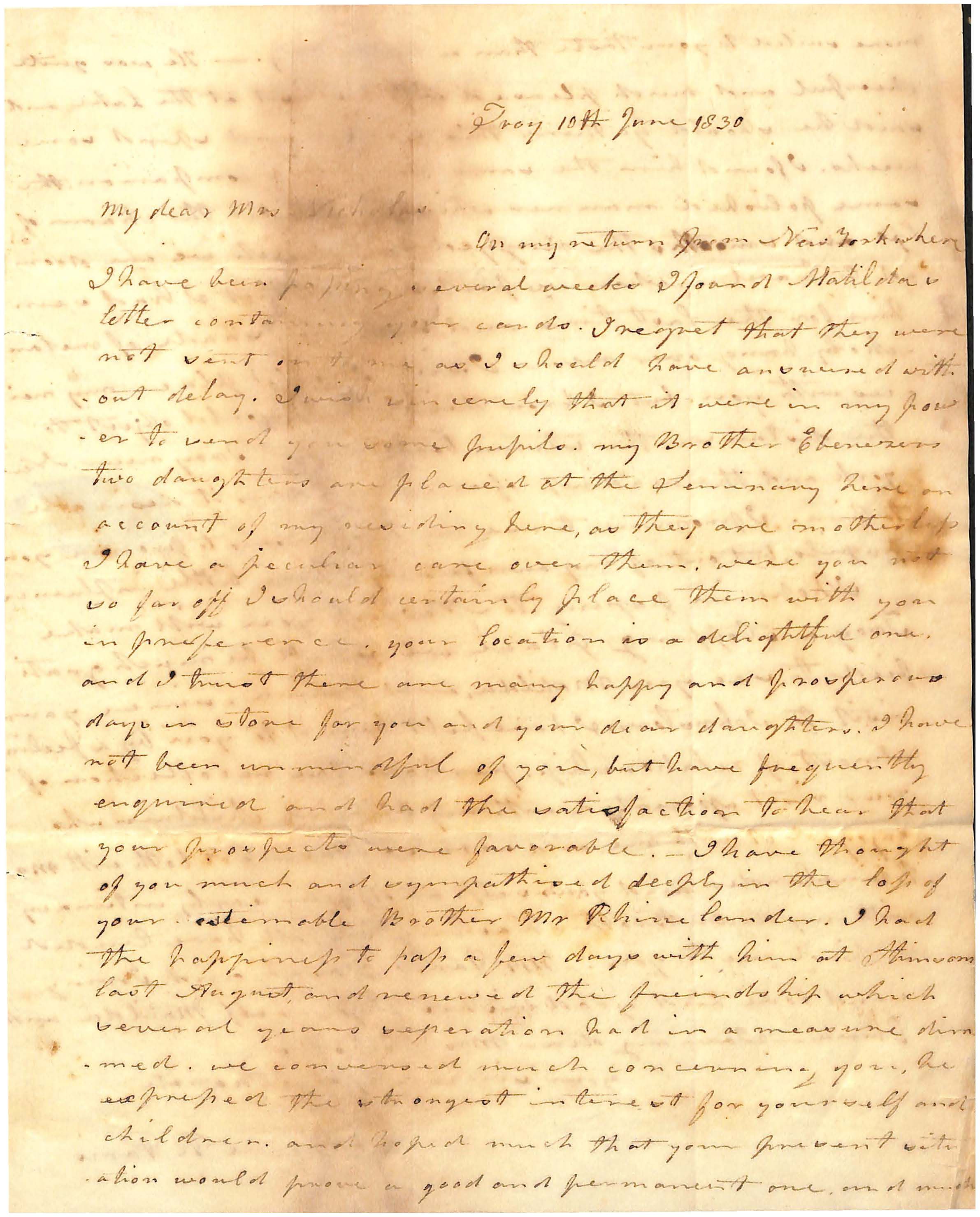 Your interesting young “protege” I [staining] has been/ [dangerously] ill, but is now happily convalescing- I visited him/ when his recovery was [consied.] doubtful and I was pleased with the spirit/ of fortitude & submission he manifested- I have yet much confidence/ in the piety of the young man, I indulge the hope that he will/ one day occupy the important station in the [Zion] of God./ I have seed the “Republic of L[staining]” from 33 to 66- the 3rd/ volume is I believe include in 53 to 65 is it not so? The 4th comment/ with “Marriage a Novel”- I pray who is the mister? This imp-/-ortant information must decide for [staining] I can afford/ time for pursuing it- I have not yet looked over the [Nos.]/ but merely into them, which the permeable design a good one/ as [forming] a library [select] “[belles] letters,”- /