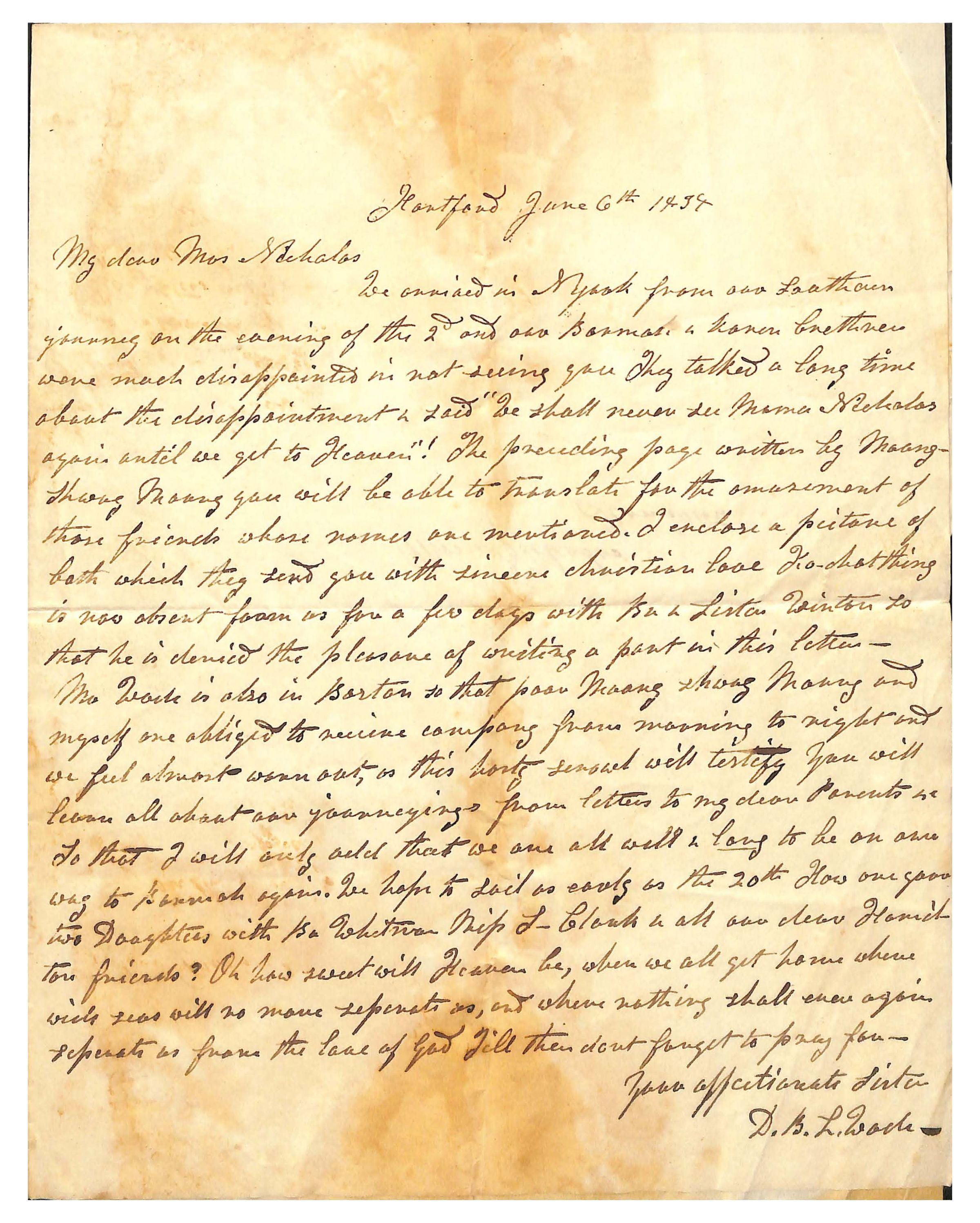 [PAGE 1] Hartford June 6th 1834/ My dear Mrs. Nicholas,/ I’ve arrived in Nyack from our loathsom/ journey on the evening of the 2nd and B[unrecovered] & Karen brethren/ were much disappointed in not seeing you They talked a long time/ about their disappointment & said “We shall never see Mama’s Nicholas/ again until we get to Heaven”! The preceding page written by [unrecovered]/[unrecovered] you will be able to translate for the amusement of/ those friends whose names are mentioned. I enclose a picture of/ both which they send you with sincere christian love [unrecovered]/ is now absent from us for a few days with [Isa?] & Sister Winton so/ not he denied the pleasure of writing a part in this letter-/Mr W[ork] is also in Boston so that poor [unrecovered] and/ myself are obliged to receive company from morning to night and/ we feel almost worn out, as this [unrecovered] [unrecovered] will testify you will/ learn all about our journeying from letters to my dear Parents &/ To that I will also add that we are all well & long to be on our/ way to Boston again. We hope to sail as early as the 20th How are your/ two Daughters with [Pa] Whitman Miss L- Clark & all our dear Hamil-/tons friends? Oh how sweet will Heaven be, when we all get home where/ wide seas will not more separate us, and where nothing shall ever again/ separate us from the face of God Till then dont forget to pray for-/ Your affectionate sister/D.B.L. Wade/ [END OF PAGE 1] [PAGE 2] [Written in Burmese] [END OF PAGE 2] [Address] Mrs. Nicholas Hamilton [END OF LETTER]Created By