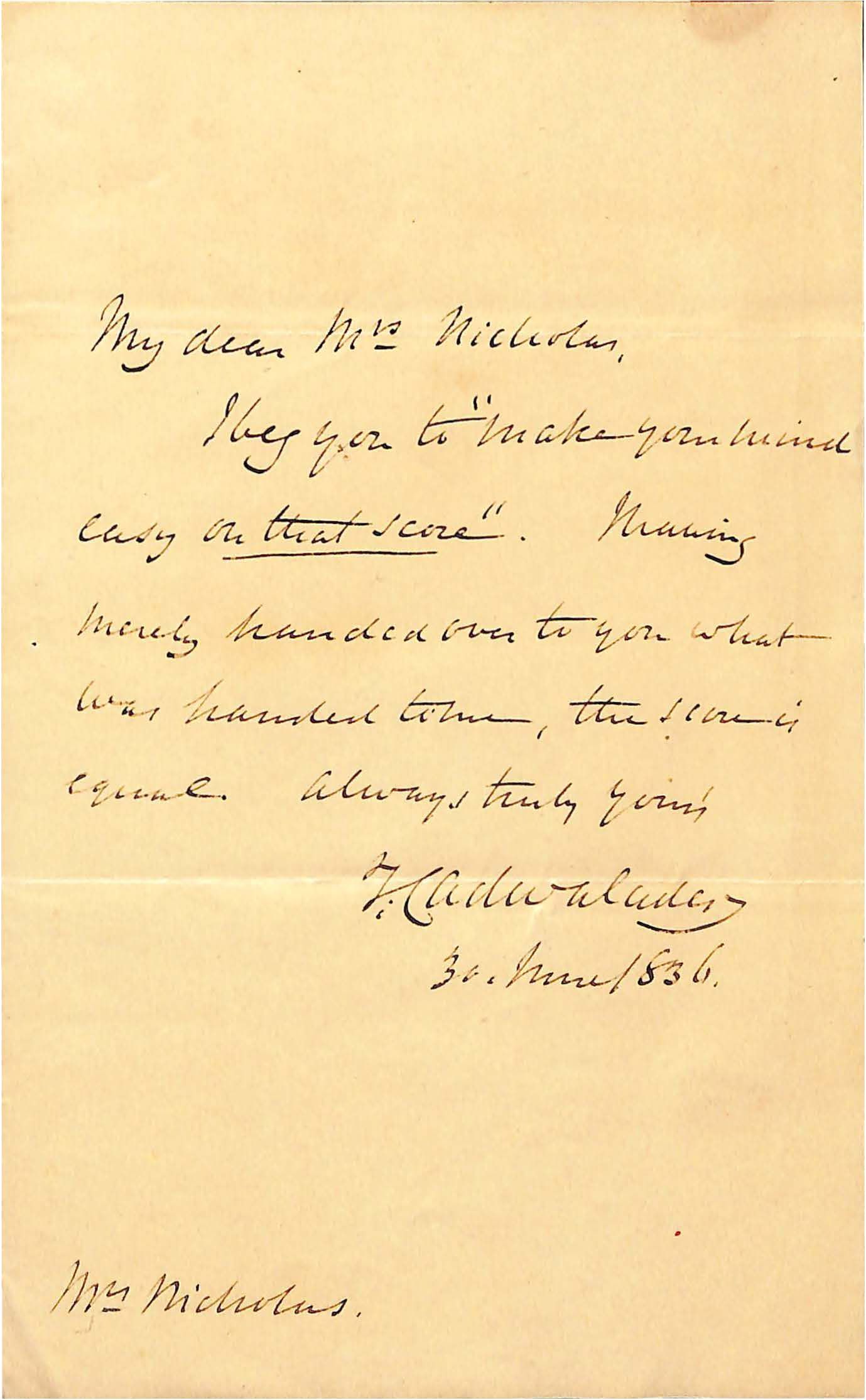 I beg you to “make your mind/ easy on that score.” Having/ merely handed over to you what/ was handed to me, the score is/ equal/ Always truly yours/
