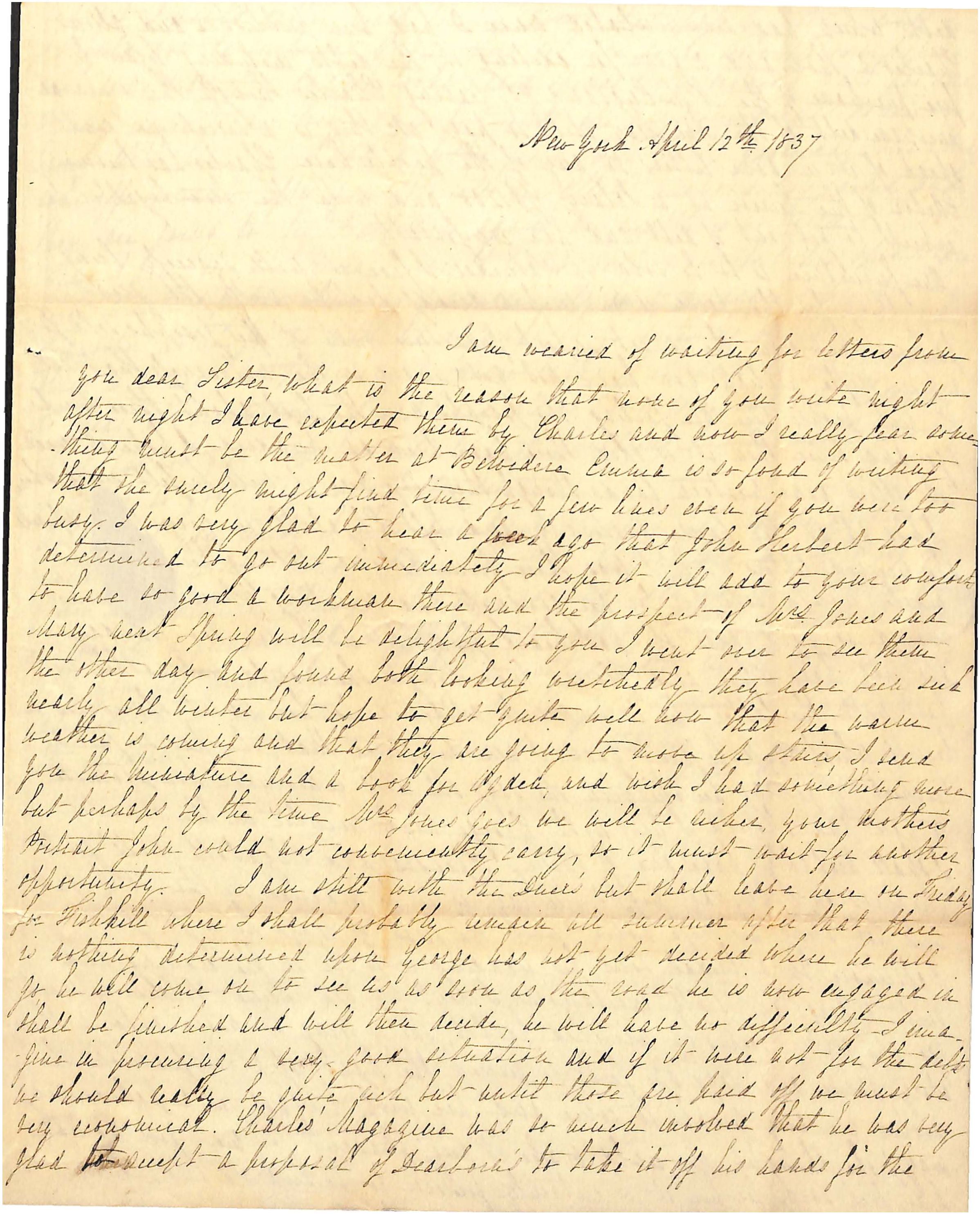 I am wearied of waiting for letters from/ you dear Sister, what is the reason that none of you write night/ after night I have expected them by Charles and now I really fear some/ thing must be the matter at Belvidere Emma is so fond of writing/ that she surely might find time for a few lines even if you were too/ busy. I was very glad to hear a few weeks ago that John Herbert had/ determined to go out immediately I hope it will add to your comfort/ to have so good a workman there and the prospect hope it will add to your comfort/ to have so good a workman there and the prospect of Mrs jones and/ Mary next Spring will be delightful to you I went over to see them/ the other day and found both looking [wretchedly] they have been sick/ nearly all winter but hope to get quite well now that the warm/ weather is coming and that they are going to move up stairs, I send/ miniature and a book for Ogden and wish I had something more/ but perhaps by the time Mrs Jones foes we will be richer, your mothers/ portrait John could not conveniently carry, so it must wait for another/ opportunity. I am still with the Duer’s but shall leave here on Friday/ for Fishkill where I shall probably remain all summer after that there/ is nothing determined upon George has not yet decided where he will come on to see us as soon as the road he is now engaged in/ shall be finished and will then decide. he will have no difficulty- I [unrecovered]/ give in procuring a very good situation and if it were not for the debt/ we should nearly be quite rich but until those are paid off we must be/ very economical. Charles magazine was so much involved that he was very/ glad to accept a proposal of Dearborn’s to take it off his hands for the/