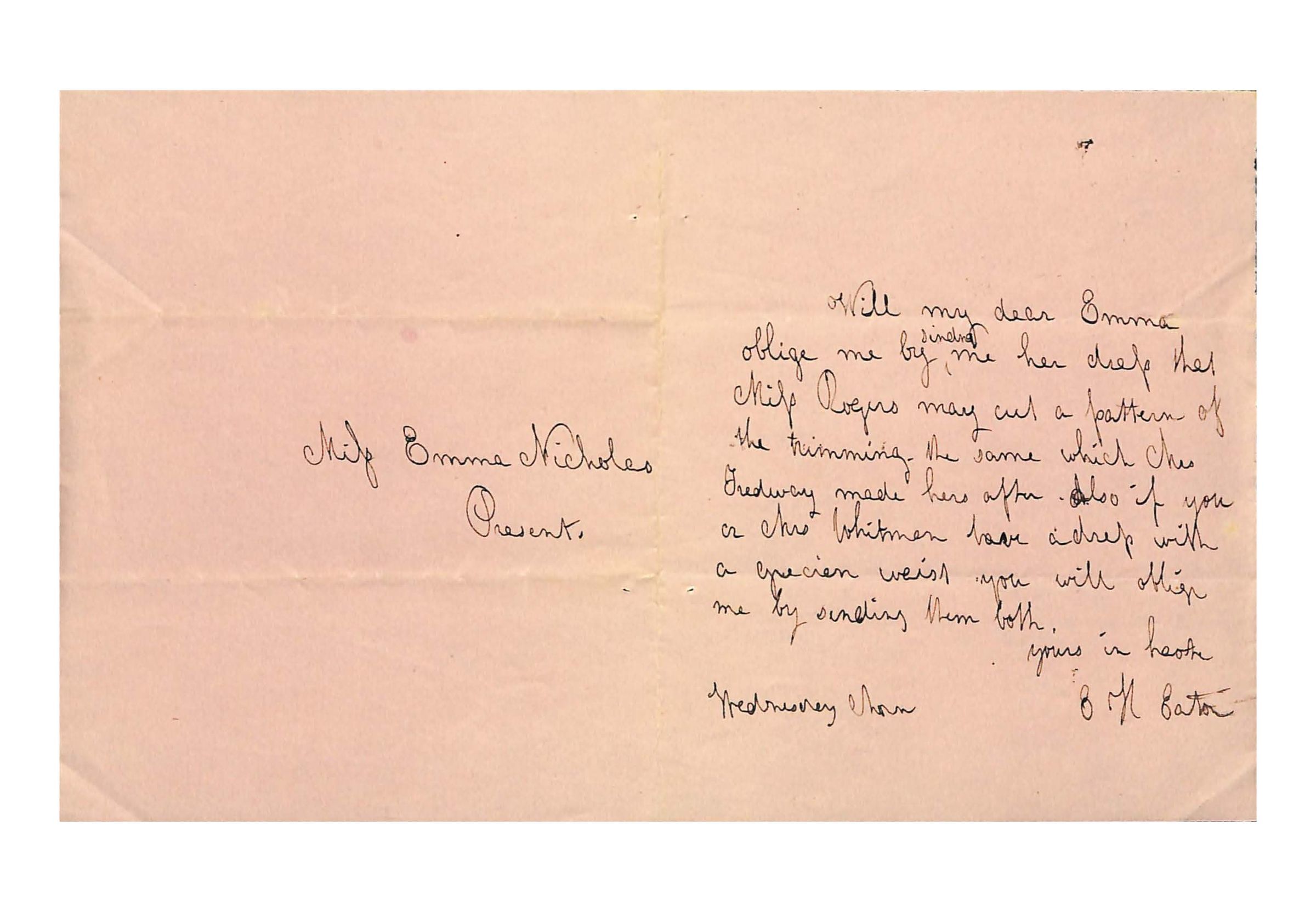 Oblige me by [^ sinding (sic)] me her dress that / Miss Rogers may cut a pattern of / the trimming the same which Mrs / Tredway made hers after _ Also if you / or Mrs Whitman have a dress with / a grecian waist you will oblige / me by sending them both