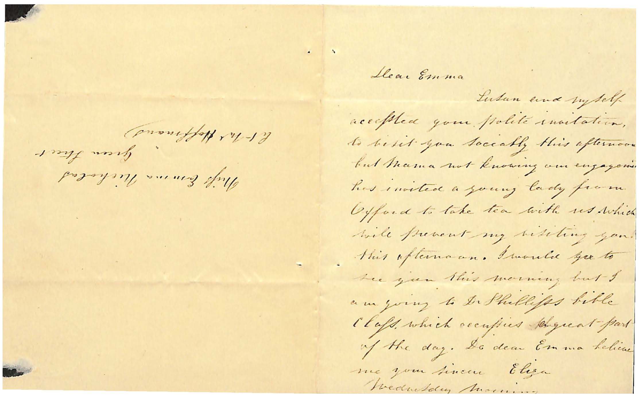 Susan and myself / accepted your polite invitation / to visit you socially this afternoon / but Mama not knowing our engagement / has invited a young lady from / Oxford to take tea with us which / will prevent my visiting you / this afternoon. I would go to / see you this morning, but I / am going to Dr Phillips Bible / Class which occupies a great part / of the day. Do dear Emma believe / me your sincere Eliza
