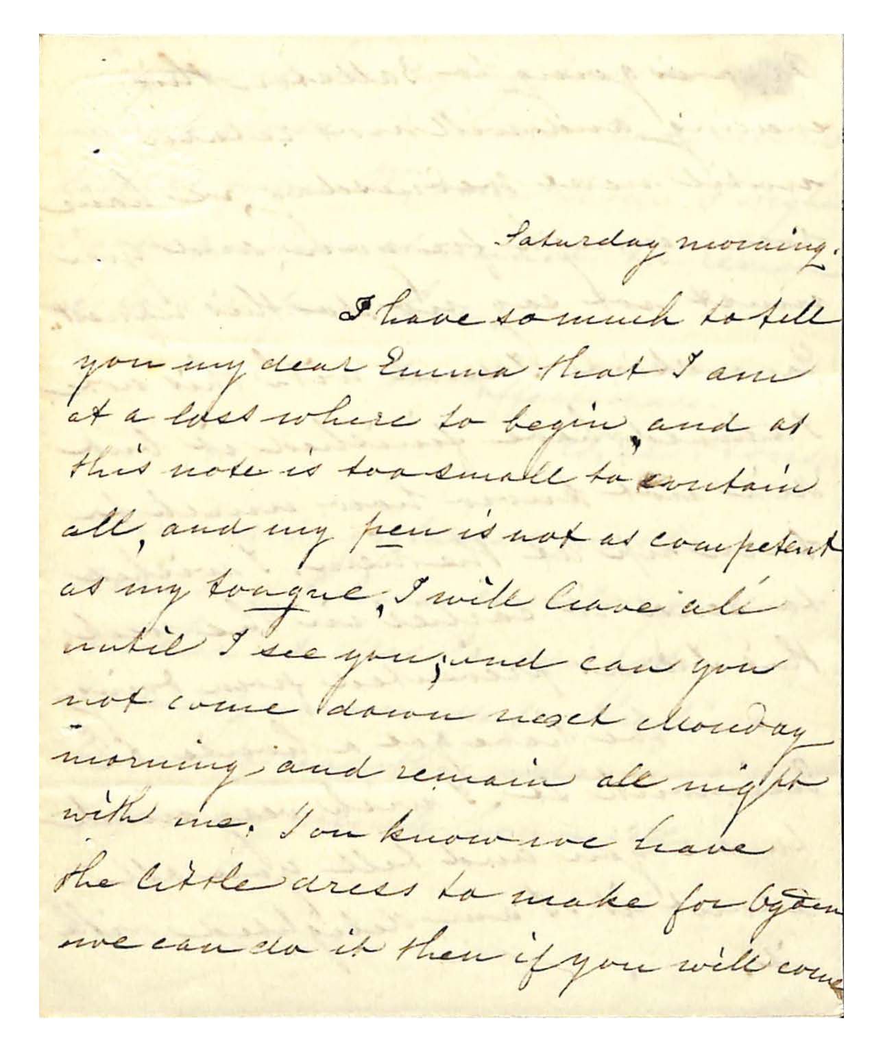 I have so much to tell / you my dear Emma that I am / at a loss where to begin, and at / this note is too small to contain / all, and my pen is not as competent / as my tongue, I will save all / until I see you, and can you / not come down next Monday / morning and remain all night / with me. You know we have / the little dress to make for Ogden / we can do it then if you will come /