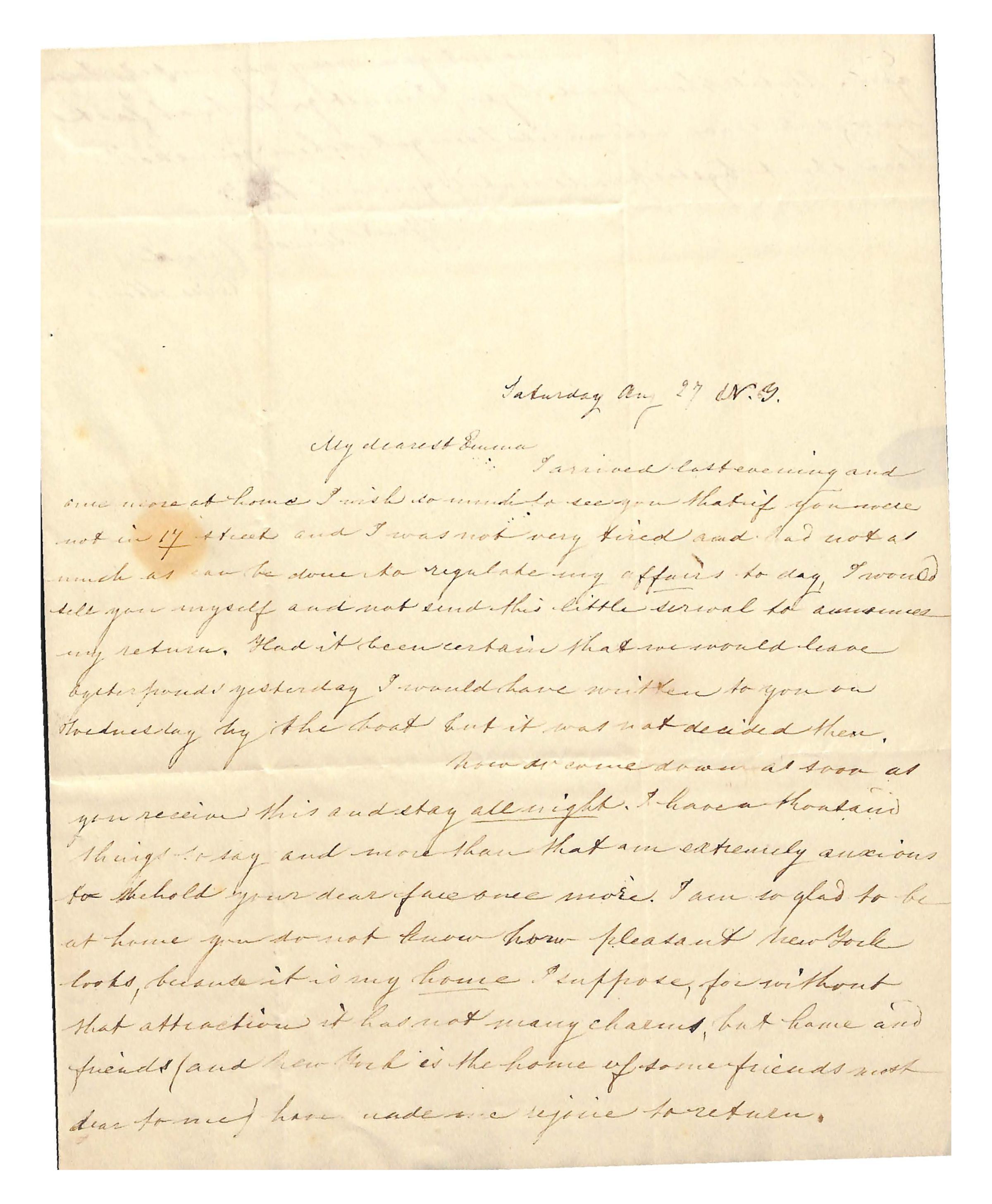 Now do come down as soon as / you receive this and stay all night. I have a thousand / things to day and more than that I am extremely anxious / to behold your dear face once more. I am so glad to be / at home you do now know how pleasant New York / looks, because it is my home I suppose, for without / that attraction it has not many charms, but home and / friends (and New York is the home of some friends most / dear to me) have made me rejoice to return.