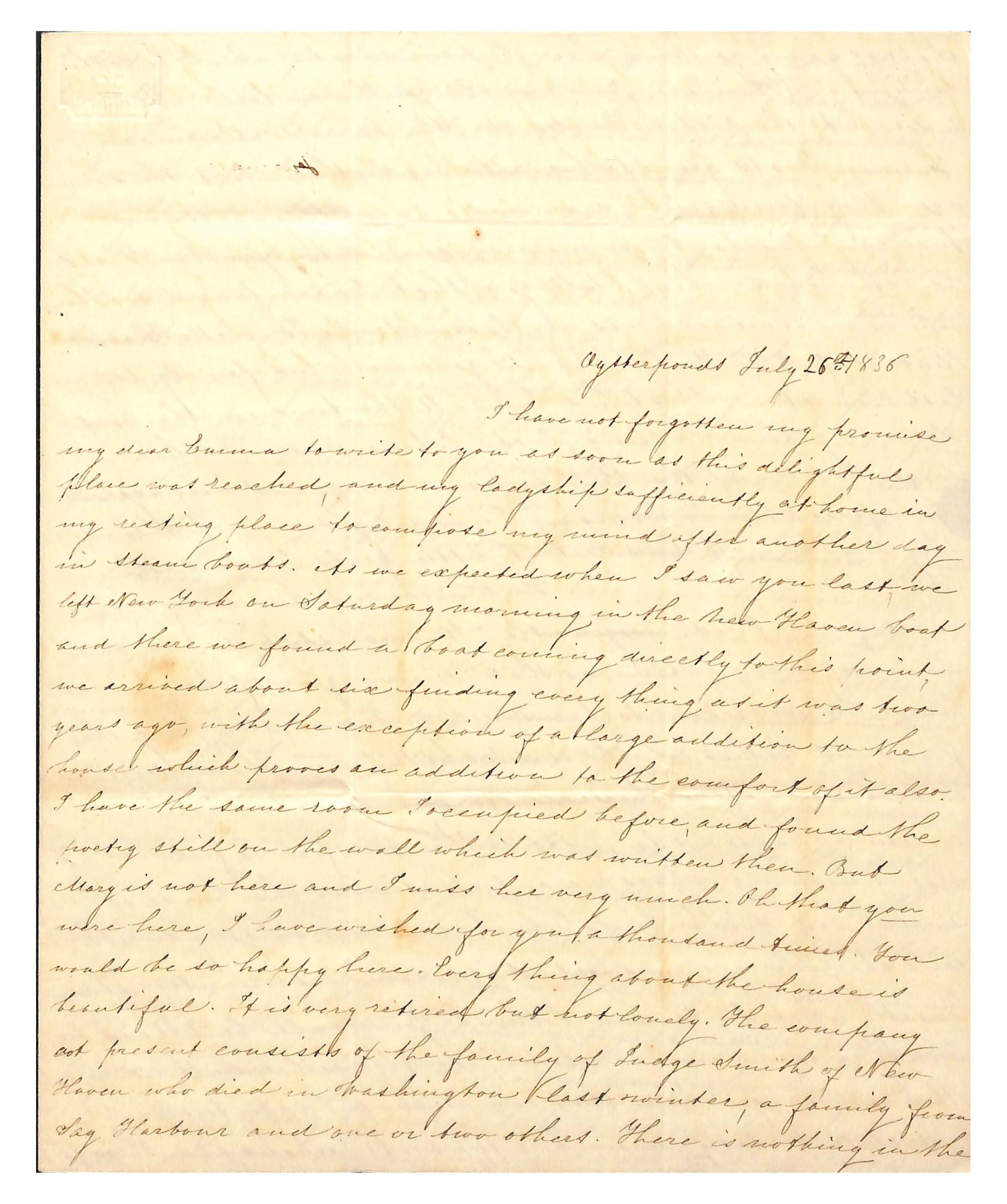 I have not forgotten my promise / my dear Emma to write to you as soon as this delightful / place was reached and my ladyship sufficiently at home in / my resting place to compose my mind after another day / in steam boats. As we expected when I saw you last, we / left New York on Saturday morning in the New Haven boat / and there we found a boat coming directly to this point, / we arrived about six finding every thing as it was two / years ago, with the exception of a large addition to the / house which proves an addition to the comfort of it also. / I have the same room I occupied before, and found the / poetry still on the wall which was written then. But / Mary is not here and I miss her very much. Oh that you / were here, I have wished for you a thousand times. You / would be so happy here . Every thing about the house is / beautiful. It is very retired but not lonely. The company / at present consists of the family of Judge Smith of New / Haven who died in Washington last winter, a family from / Sag Harbor and one or two others. There is nothing in the /