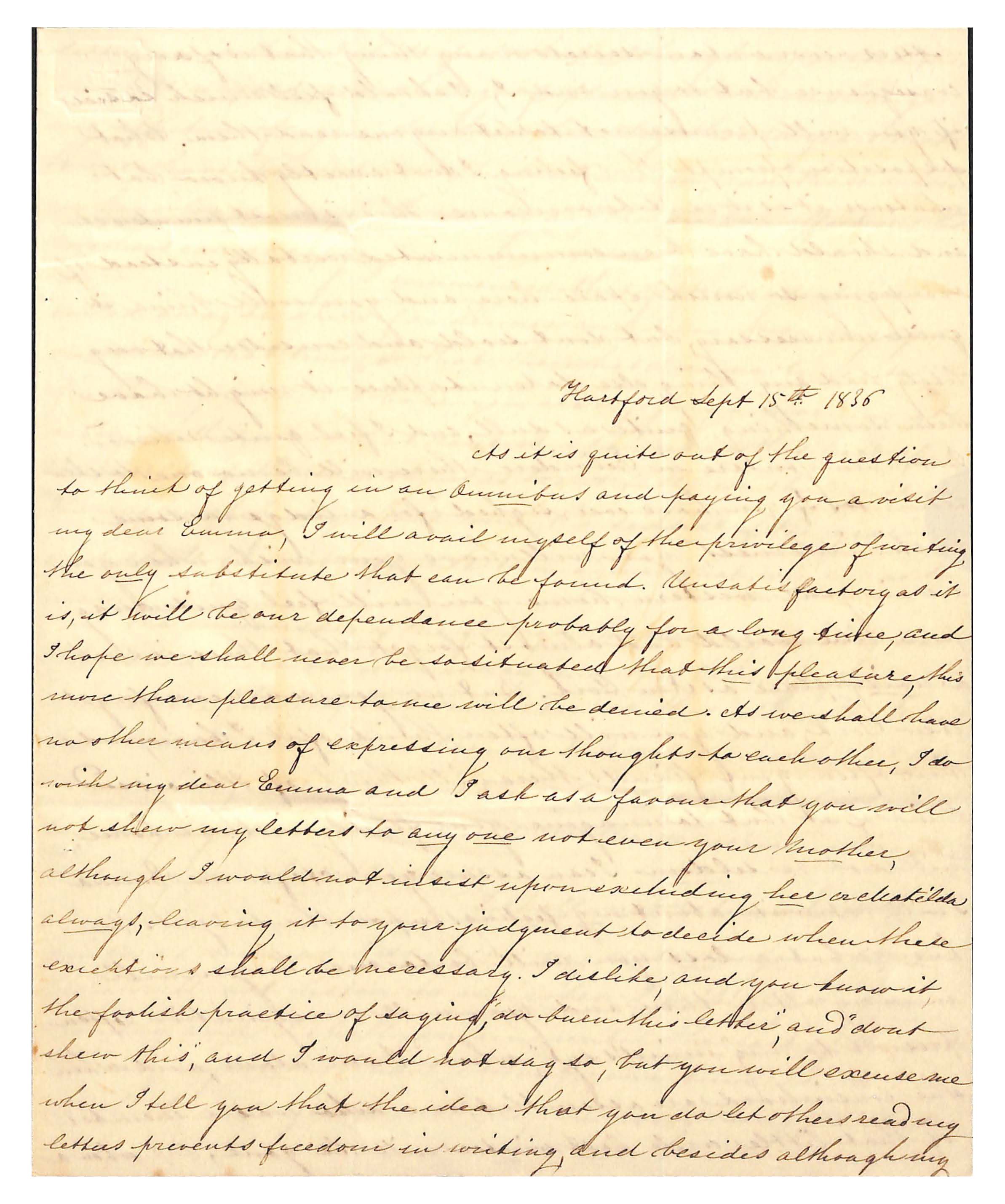As it is quite out of the question / to think of getting in an Omnibus and paying you a visit / my dear Emma, I will avail myself of the privilege of writing / the only substitute that can be found. Unsatisfactory as it / is, it will be our dependance probably for a long time, and / I hope we shall never be so situated that this pleasure, this / more than pleasure to me will be denied. As we shall have / no other means of expressing our thoughts to each other, I do / with my dear Emma and I ask as a favour [sic] that you will / not shew [sic] my letters to any one not even your mother, / although I would not insist upon excluding her or Matilda / always, leaving it to your judgment to decide when these / exceptions shall be necessary. I dislike, and you know it / the foolish practice of saying, “do burn this letter”, and “don’t / shew [sic] this” and would not say so, but you will excuse me / whenI tell you that the idea that you do let others read my / letters prevents freedom in writing, and besides although my /