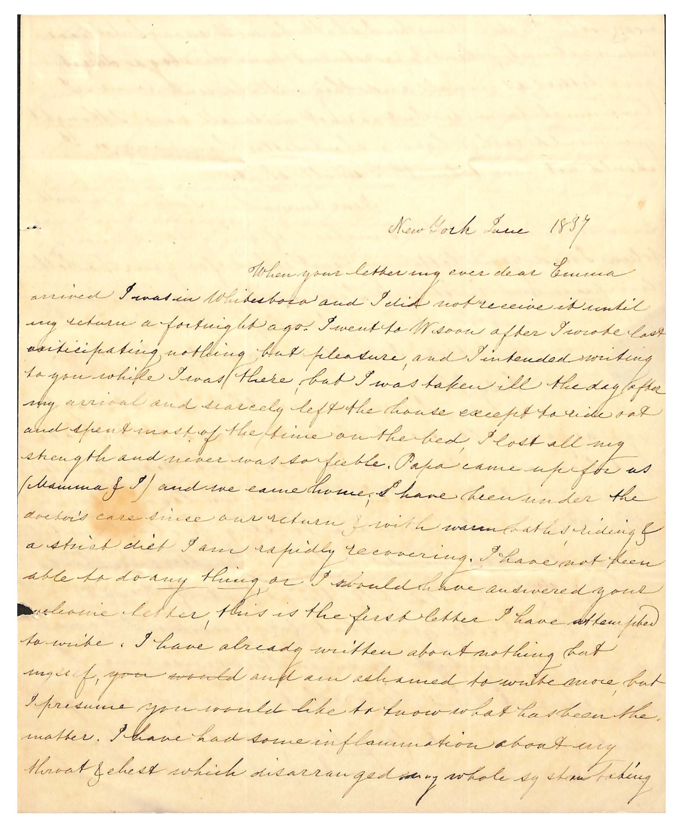 When your letter my ever dear Emma / arrived I was in Whitesboro and I did not receive it until / my return a fortnight ago. I went to W soon after I wrote last / anticipating nothing but pleasure, and I intended writing / to you while I was there, but I was taken ill the day after / my arrival and scarcely left the house except to ride out / and spent most of the time on the bed, I lost all my / strength and never was so feeble. Papa came up for us / (Mamma & I) and we came home, I have been under the / doctor’s care since our return & with warm baths, riding & / a strict diet I am rapidly recovering. I have not been / able to do any thing or I would have answered your / welcome letter, this is the first letter I have attempted / to write. I have already written about nothing but / I presume you would like to know what has been the / matter. I have had some inflammation about my / throat & chest which disarranged my whole system taking /