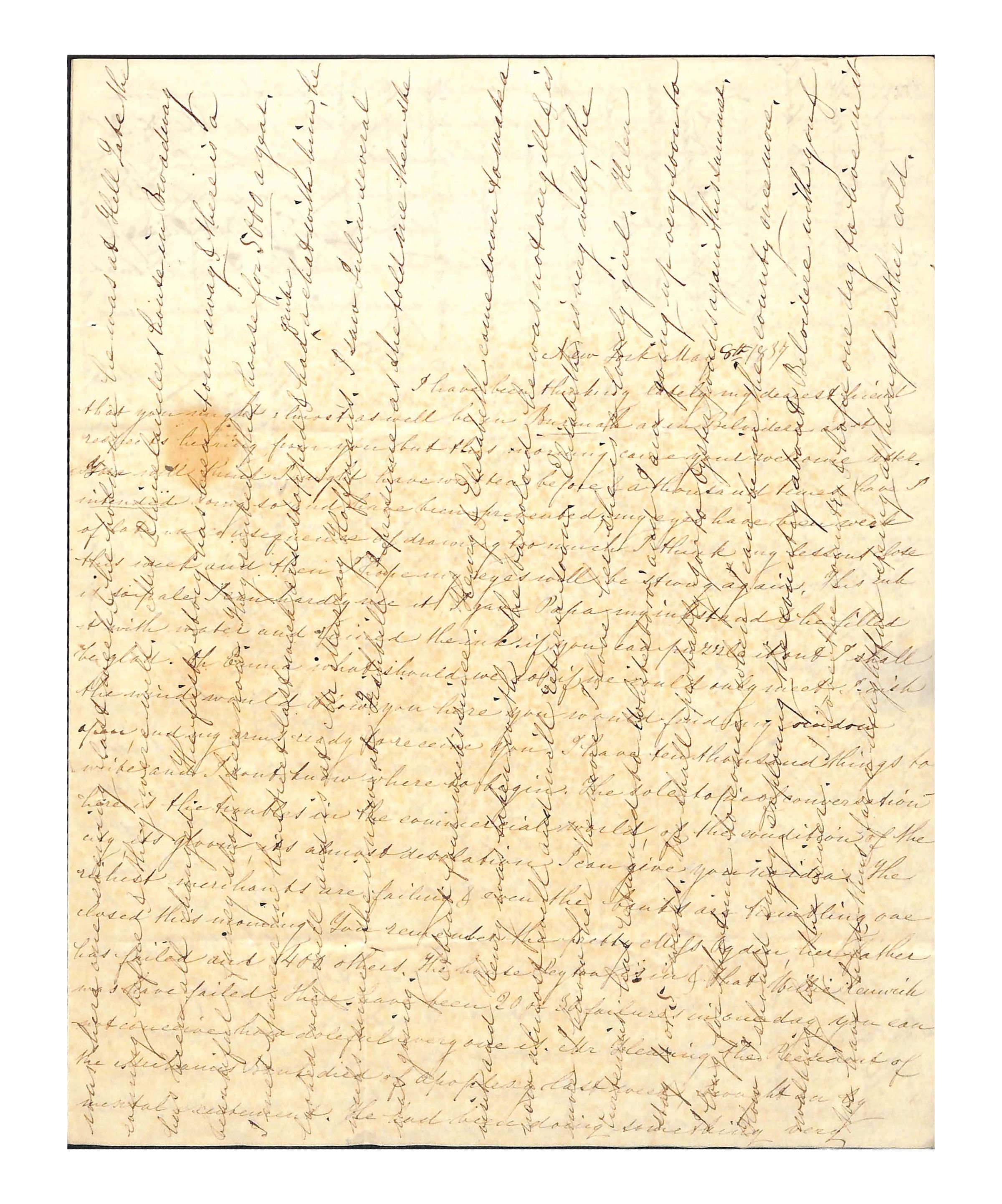I have been thinking lately my dearest friend / that you might almost as well be in Burmah as in Belvidere as it / respects hearing from you but this morning came your welcome letter. / You will think I might have written before & a thousand times have I / intended doing so and have been prevented, my eyes have been weak / of late in consequence of drawing too much I think my lessons close / this week and then I hope my eyes will be strong again. This ink / is so pale I can hardly use it. I have Pape my ink stand & he filled / it with water and ruined the ink. If you can puzzle it out I shall / be glad. Oh Emma what should we do if we could only meet I wish / the winds would blow you here you would find my window / open, and my arms ready to receive you. I have ten thousand things to / write and I don’t know where to begin. The sole topic of conversation / here is the troubles in the commercial world, of the condition of the / city, its gloom, its [sic] almost desolation. I can give you no idea. The / richest merchants are failing & even the banks are trembling, one / closed this morning. You remember the pretty Miss Ogden, her father / has failed and 400 others. The house Peyton is in & that Willie Renwick / was have failed. THere have been 20 or 30 failures in one day, you can / not conceive how doleful of everyone is. Mr Hewing the President of the / the Mechanics Bank died of apoplexy last week, brought on by / mental excitement. He had been doing something very /