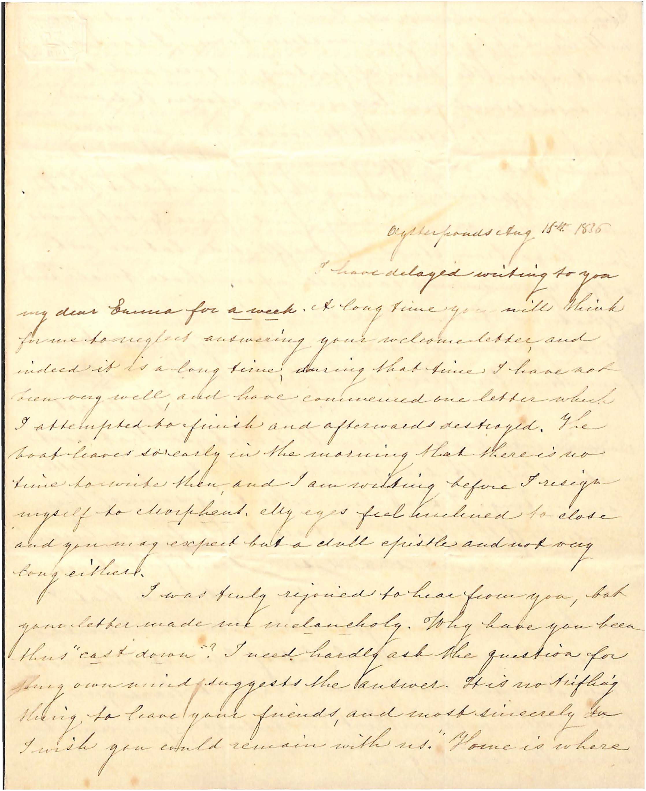 I have delayed writing to you / my dear Emma for a week. A long time you will think / for me to neglect answering you welcome letter and / indeed it is a long time during that time I have not / been very well, and have commenced one letter which I attempted to finish and afterwards destroyed. The boat leave so early in the morning that there is no / time to write then, and I am writing before I resign / myself to Morpheus. My eyes feel inclined to close . and you may expect but a dull epistle and not very / long either.