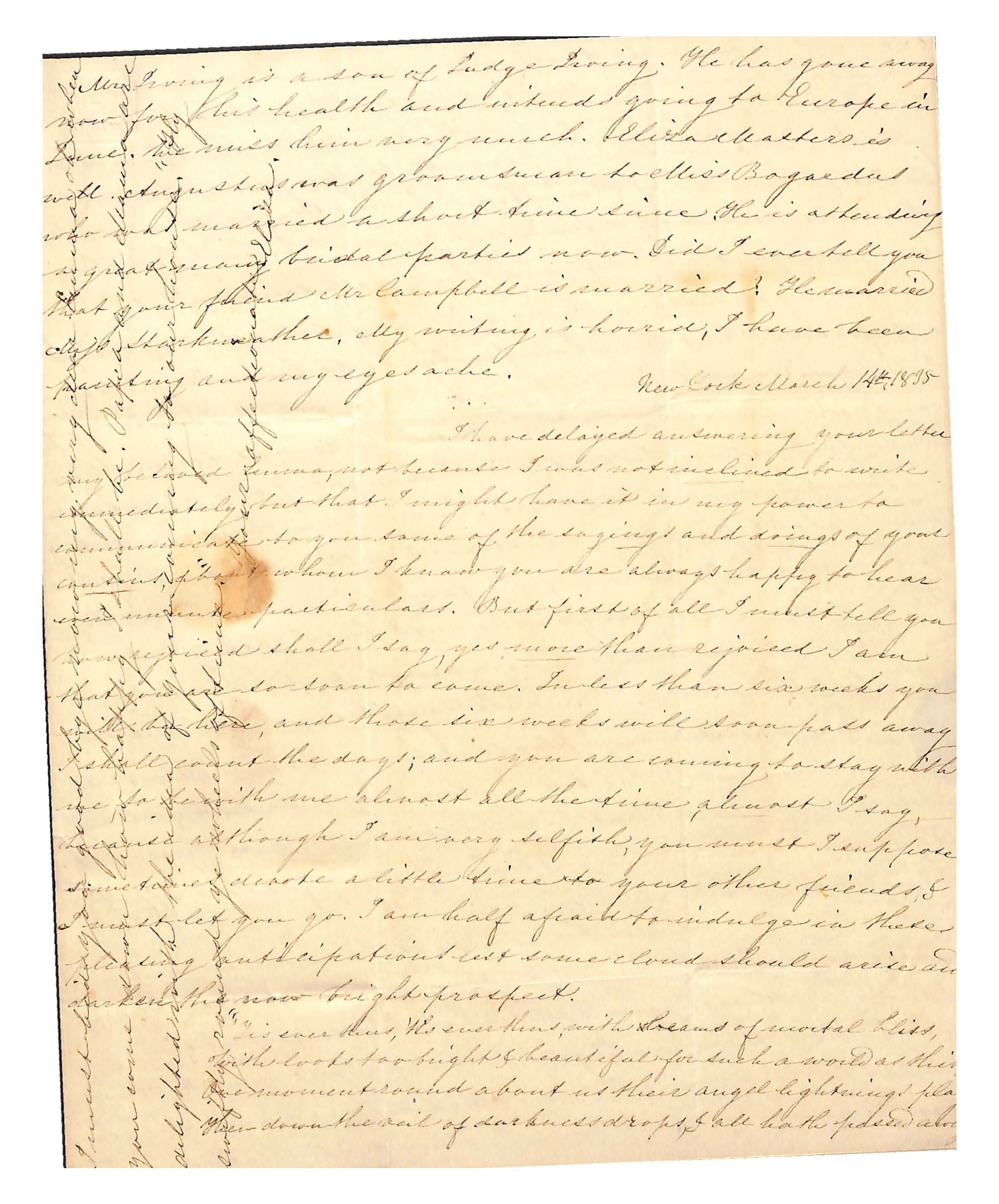 Last Wednesday I was at a little / sociable party at Cornelia Livingston’s. Mary Stevens was / there and Phil was there. I had the pleasure of talking / more than usual with him, and we talked about you / sometimes. You see we never forget you. Last evening / I drank tea with Mary Stevens and there met Mary / Rhinelander, and [Jenny] Renwick, and Cornelia & another / Mary Rhinelander, Phil & Phil Paulding & Mr Renwick, Willy / Renwick as Mary says and I have caught her way & say / Phil and Willy, in private I mean, for I always say Mr. / with much dignity when I address them. Mary Rhinelander [page torn] / talked together a long I like her very much. I asked / Phil if he had any message to send, he told me he had / written a long letter to you. I spent a very pleasant / evening, Papa came for me and we did not leave until / near eleven, it was an accidental kind of little party. / When I went to drawing school Mary asked me to / come up to tea that Jenny Renwick was coming & other / that she sent for the rest of the cousinhood & for / Cornelia. I enjoy myself very much, it is a delightful circle / and when you come I shall be still happier. You